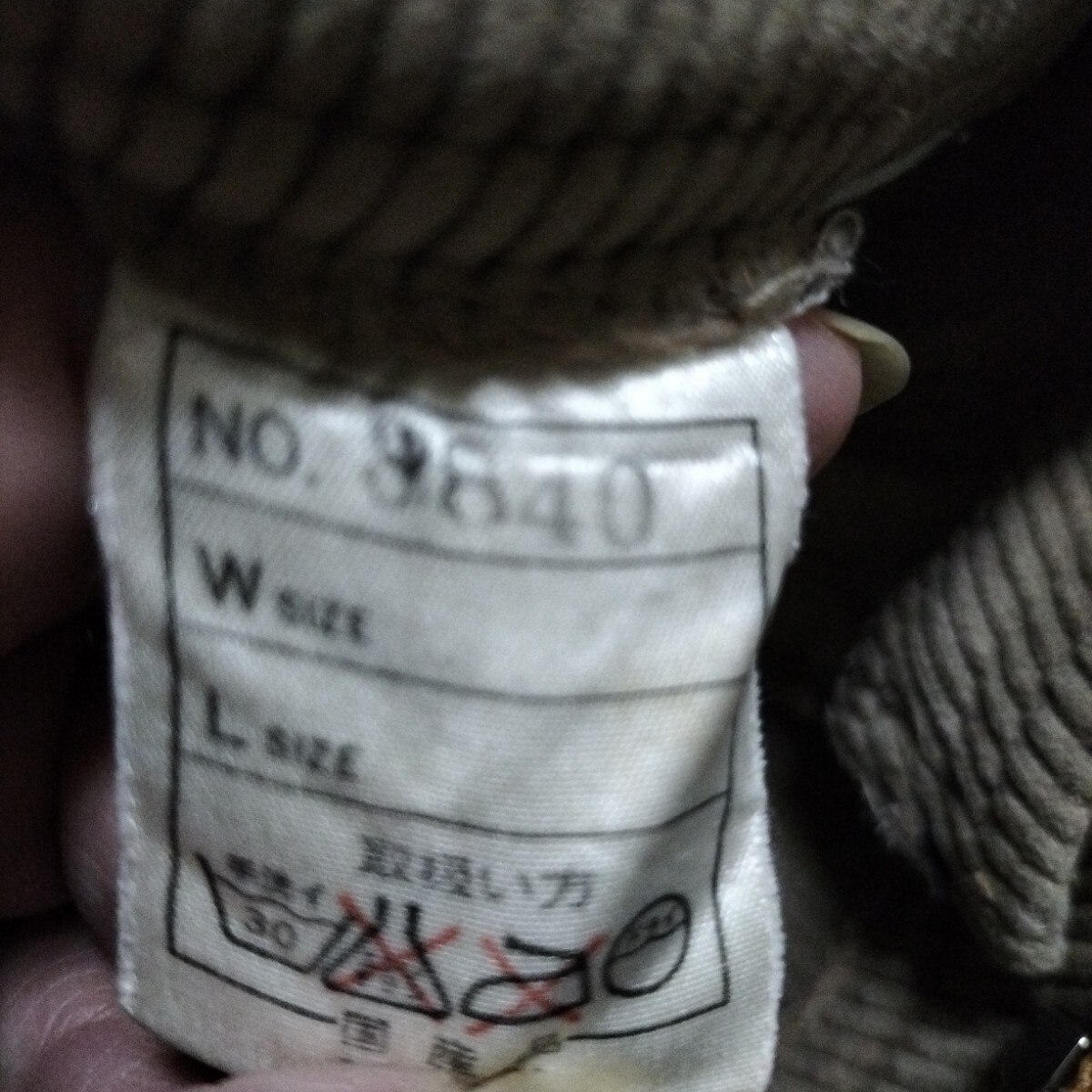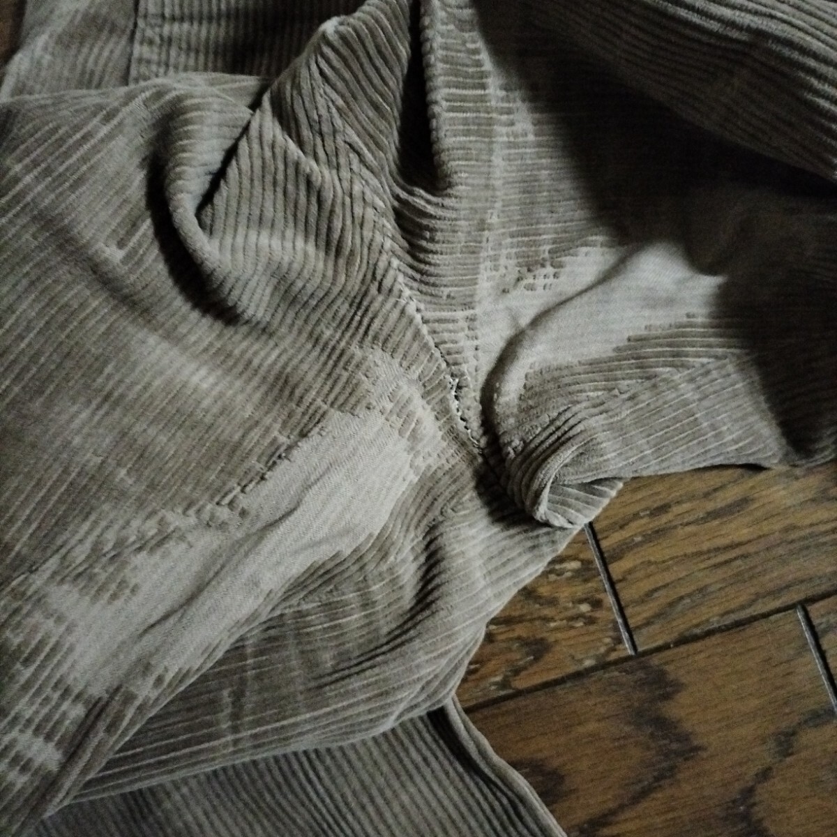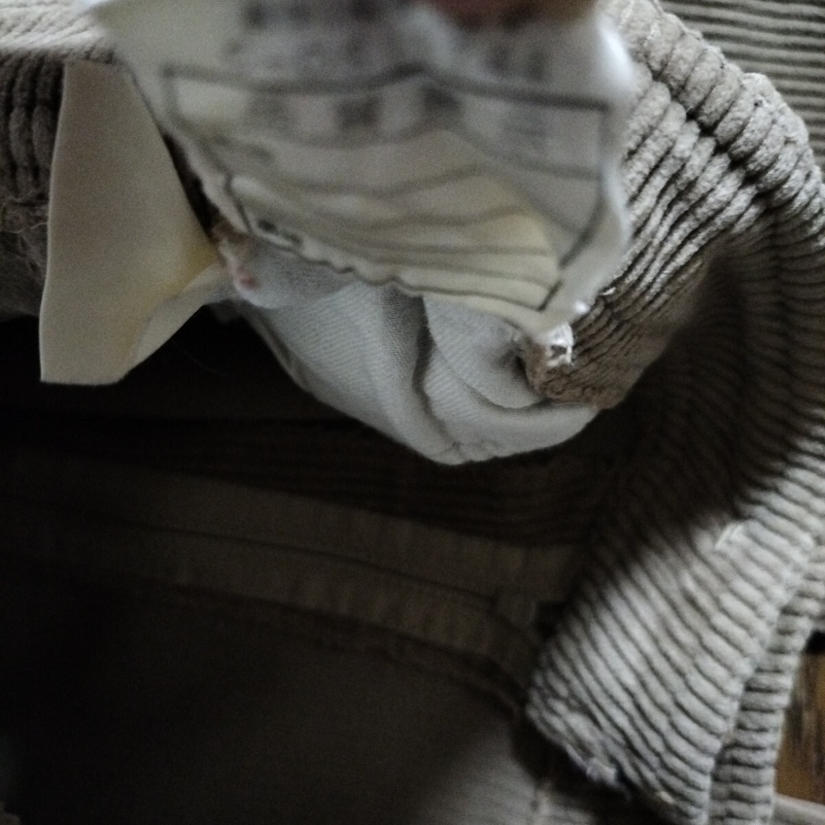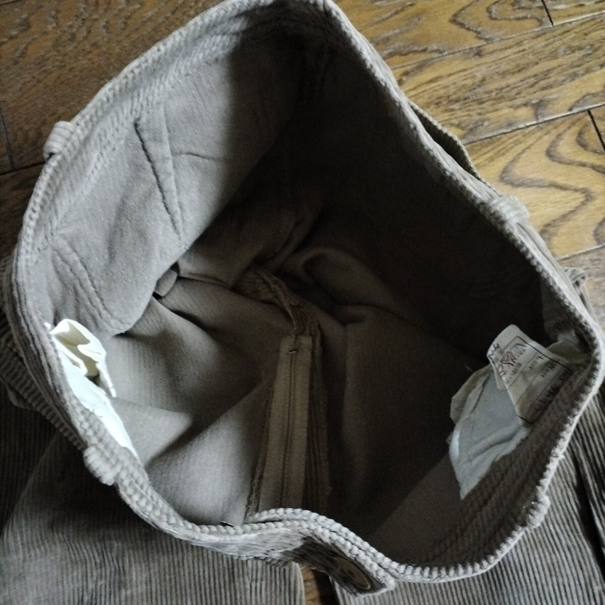 ベージュのコーデュロイ製ストレートレッグパンツ、前ポケット付き