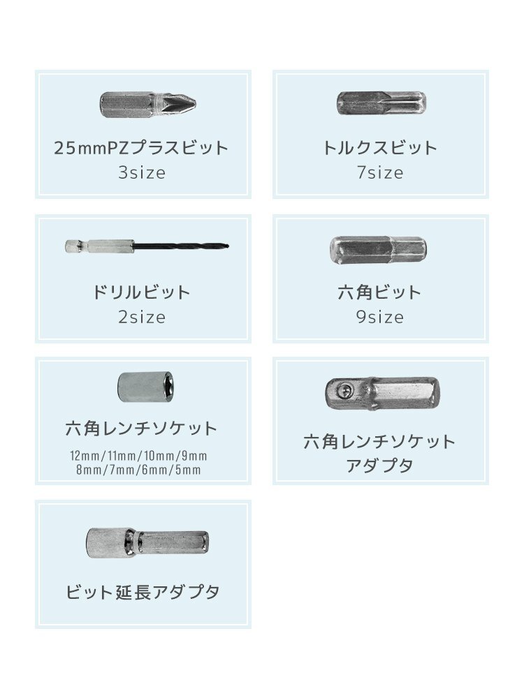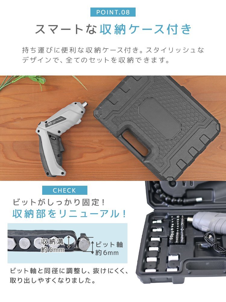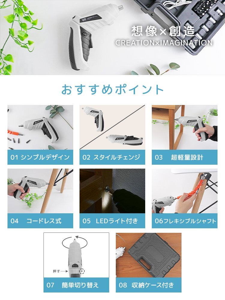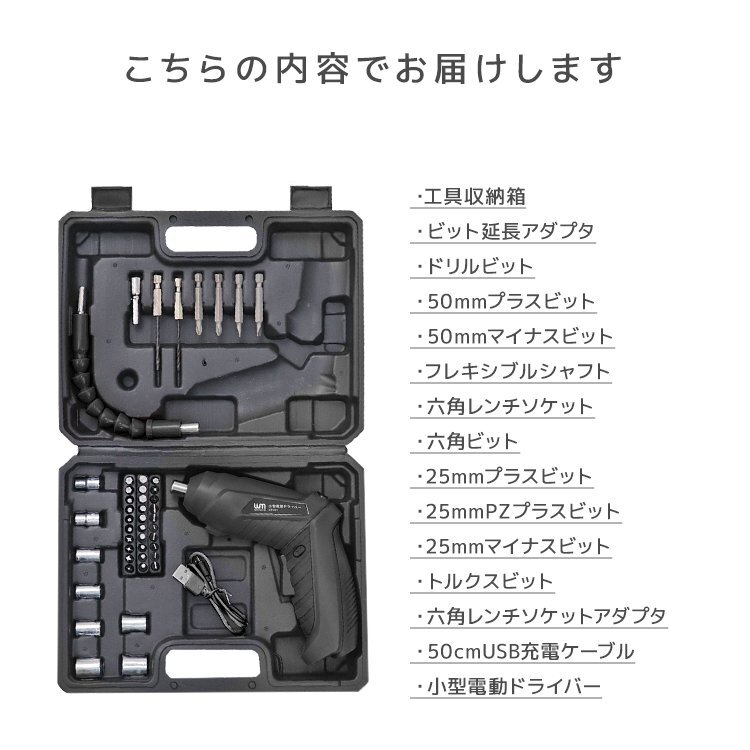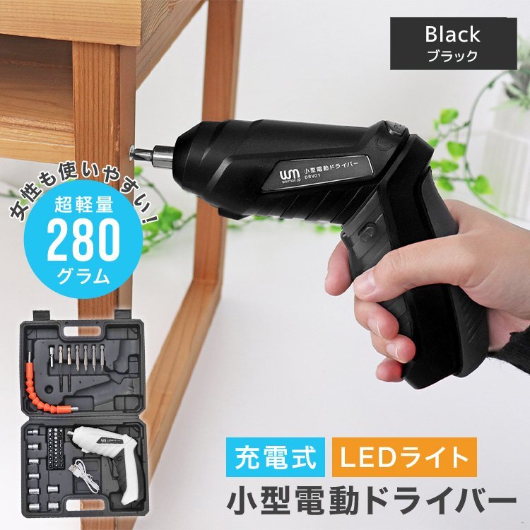 \カンタン&らくらく♪どこでも使えるコードレス/ コードレスで手軽に使える充電式電動ドライバーです。 軽量&コンパクトだがら、長時間の作業でも疲れにくく、女性の方でもラクに使えます! 内蔵バッテリーを充電して使うコードレスタイプのため 電源のない屋外や車内、天井等どこでも作業可能です。 LEDライト付き!暗所でも手元を照らして安全に作業ができます。 便利なフレキシブルシャフトで様々なシーンに対応します。 ネジの回転の向きは、左右のボタンを押すだけで簡単切替可能! ビット交換時は、差し込むだけ&引っ張るだけの簡単着脱! 手軽に簡単に扱えるので初めての電動ドライバーや女性の方にもおすすめです! 女性でも使いやすい超軽量&コンパクトサイズ! 長時間の作業でも疲れにくい電動ドライバーです。 内蔵バッテリーを充電して使うコードレスタイプ! 電源やコード長さを気にせず、どこでもご使用いただけます。 ボタン1つで簡単スタイルチェンジが可能です。 作業する場所に合わせて「くの字」スタイルと「ストレート」スタイルに切り替えできます! 効果的に力を入れることができ、効率よくキレイに仕上がります。 \その他、おすすめポイント/ ・手元を照らすLEDライト搭載 ・便利なフレキシブルシャフト付き ・ボタンで簡単に回転切替可能 ・簡単ビット取り付け ・持ち運びに便利な収納ケース付き セット内容は詳細画像をご確認ください。 【商品仕様】 カラー: ブラック サイズ: くの字スタイル:(約)14.5×13cm ストレートスタイル: (約)21.5cm 収納ケース: (約)23.5×18.5×奥行6.5cm 回転数: 250回転/分 充電時間: 3-5時間 可動時間: 60-70分 本体重量: 280g 材質: プラスチックABS、鉄 【商品内容】 ・小型電動ドライバー ・工具収納箱 ・ビット延長アダプタ ・ドリルビット ・50mmプラスビット ・50mmマイナスビット ・フレキシブルシャフト ・六角レンチソケット ・六角ビット ・25mmプラスビット ・25mmPZプラスビット ・25mmマイナスビット ・トルクスビット ・六角レンチソケットアダプタ ・50cmUSB充電ケーブル (ドライバ 電動ドライバ 小型ドライバ ペンドライバ ペンドライバー ドライバーセット 小型ドライバーセット ドリル 電動ドリル 小型ドリル ミニドリル 工具 2WAY 変形 軽量 LEDライト ケース おしゃれ かわいい 人気 おすすめ ウェイモール WEIMALL) |