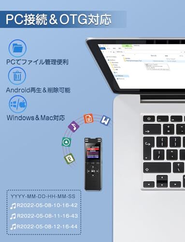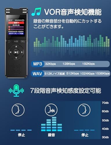 【VOR音声検知機能&分割録音パスワード保護】自動録音開始機能を搭載しているのもポイント。音声を検知すると自動で録音を開始し、無音が続けば録音が停止されます。長時間録音で発生しがちな無音部分がカットされるため、後から聞き直したときにスムーズに再生可能です。分割録音機能というのは録音時、分割しない、30分、60分、90、120分の分割時間で選択できます。ファイルを分割できる機能です。メモリーの節約に大便利な分割録音機能で、録音時間の長いファイルを分割することで、管理・確認がしやすくなっています。また、パスワード保護機能が追加されるので、パスワードを持っている方しかアクセスできない、個人情報の保護を強化できます。