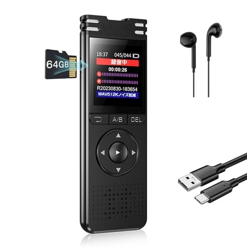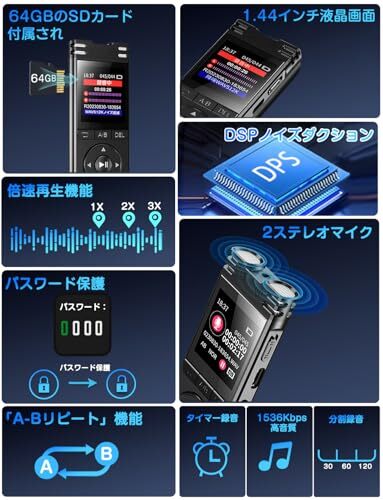 【新品未使用】【52時間連続録音】ボイスレコーダー 64G大容量 ICレコーダー 1536kbps音質 1.44インチ液晶画面 ワ