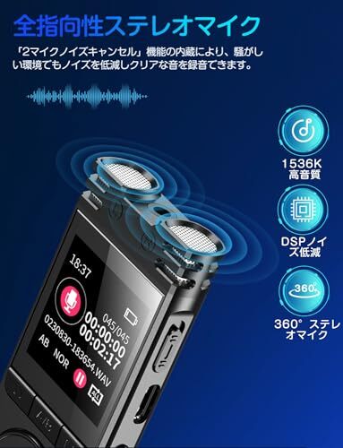 【1536kbps独自の高音質設計&全指向性マイク】録音ビットレート32〜192kbpsのMP3および512〜1536kbpsのWAVに対応しています。録音専用のチップを採用することと合わせて、加えて、「2マイクノイズキャンセル」機能の内蔵により、騒がしい環境でもノイズを低減しクリアな音を録音できます。全指向性ステレオマイクを採用しているため、遠くの音や小さな音までクリアに集音し、左右の音の差まで録音できます。臨場感あふれる高品質な音を録音できます。授業や会議などの録音再生が可能です。会議など複数人での会話など様々なシーンは役に立ちます。
