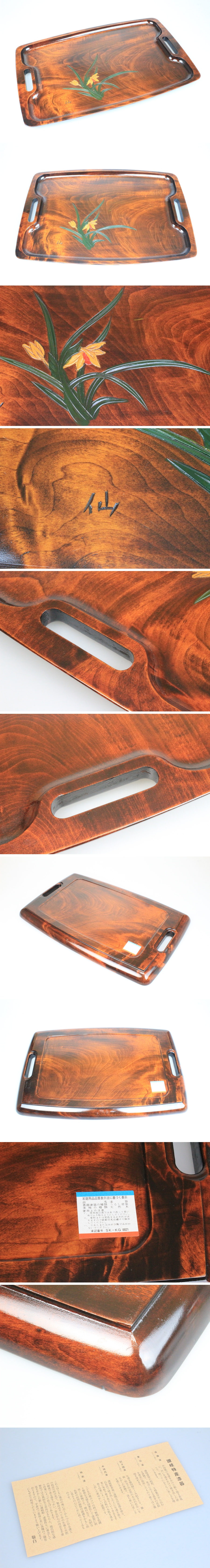 商品名 香川漆器 讃岐彫 銘 仙 丸盆 角盆 伝統工芸品 木製漆器 うるし お盆 花図 天然木 木工芸 約48.5cm×31cm