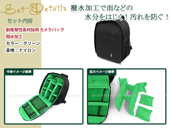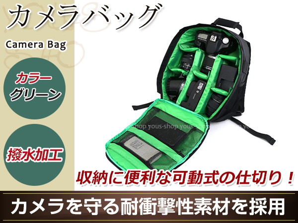 3way多機能 カメラバッグ グリーン 防水機能 耐衝撃性 撥水加工 大容量バッグ 可動式仕切りで収納便利 様々なカメラ機器に適用 リュック