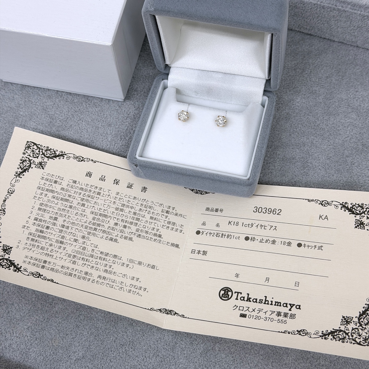 | 高島屋購入 K18 0.5+0.5ct 合わせて1ctダイヤピアスです。 当方お付き合いのお客様よりクローゼット整理でお譲りいただいたUSED品になります。 数年前に高島屋オンラインショッピングにて購入されたと伺っています。 片側0.5ct 両耳で1ctありとても見栄えのするボリュームです。 ただ高島屋とは言えダイヤについてはカラー、カットについては良いですが クラリティについては少しランクの低い石を使っているように見受けられます。 *あくまで素人意見になりますのでダイヤの見立てについてはご容赦ください。 とは言いつつも耳につけた状態でしたら分からないと思います。 これからのシーズンにお出かけされるような場面でも問題無くお使いいただけると思います。 付属品は紙箱とケースになりますが画像のようにケースにはペットがかじってしまった跡があります。 |