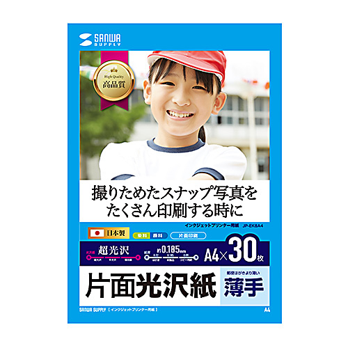 ※配送の送り主はサンワサプライ(株)と記載されています。沖縄・離島配送不可となります。 当店は正規販売代理店です。 特長 インクジェット専用紙A4サイズの光沢紙です。写真用紙としても使えます。 薄手なので手軽に大量印刷できます。 友達に配りたいとき、旅行やイベントのときなど、たくさん印刷したいときにおすすめです。 強い光沢感があり白色度も高いので、写真をより美しく再現します。 紙ベースながら写真印画紙に迫る美しい仕上がりです。 気をつけておりますが、タイミングによっては在庫切れの場合があります。 仕様