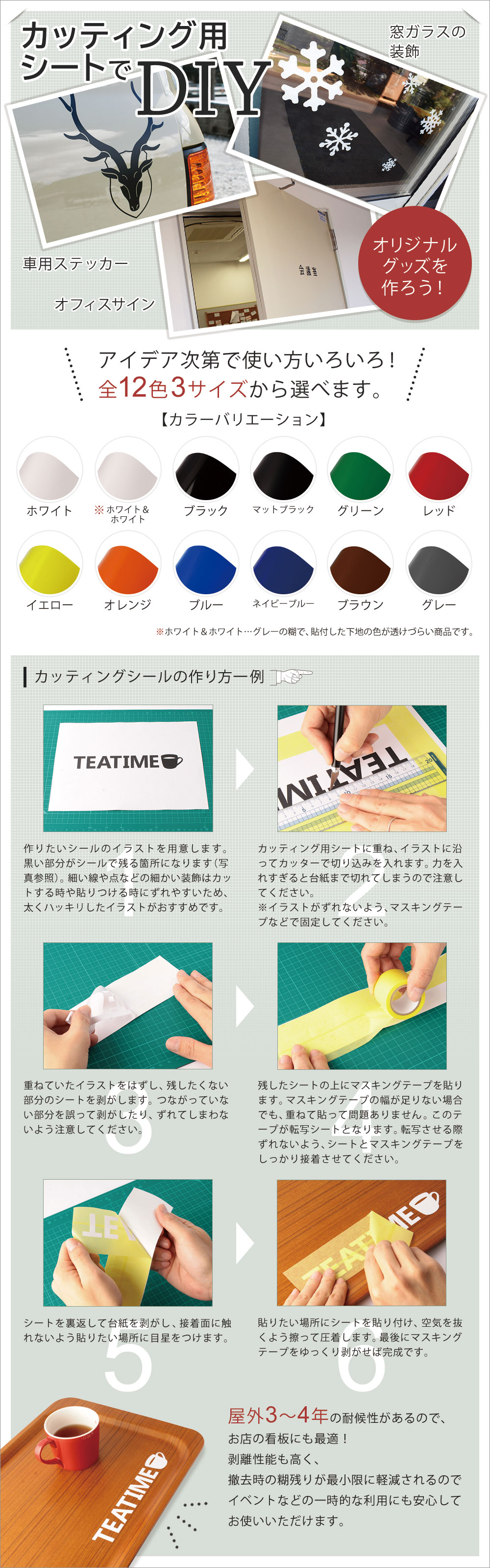 ・特殊素材への貼り付け、高温・低温・水中・その他特殊なケースでの貼り付けにつきましては、あらかじめご相談ください。