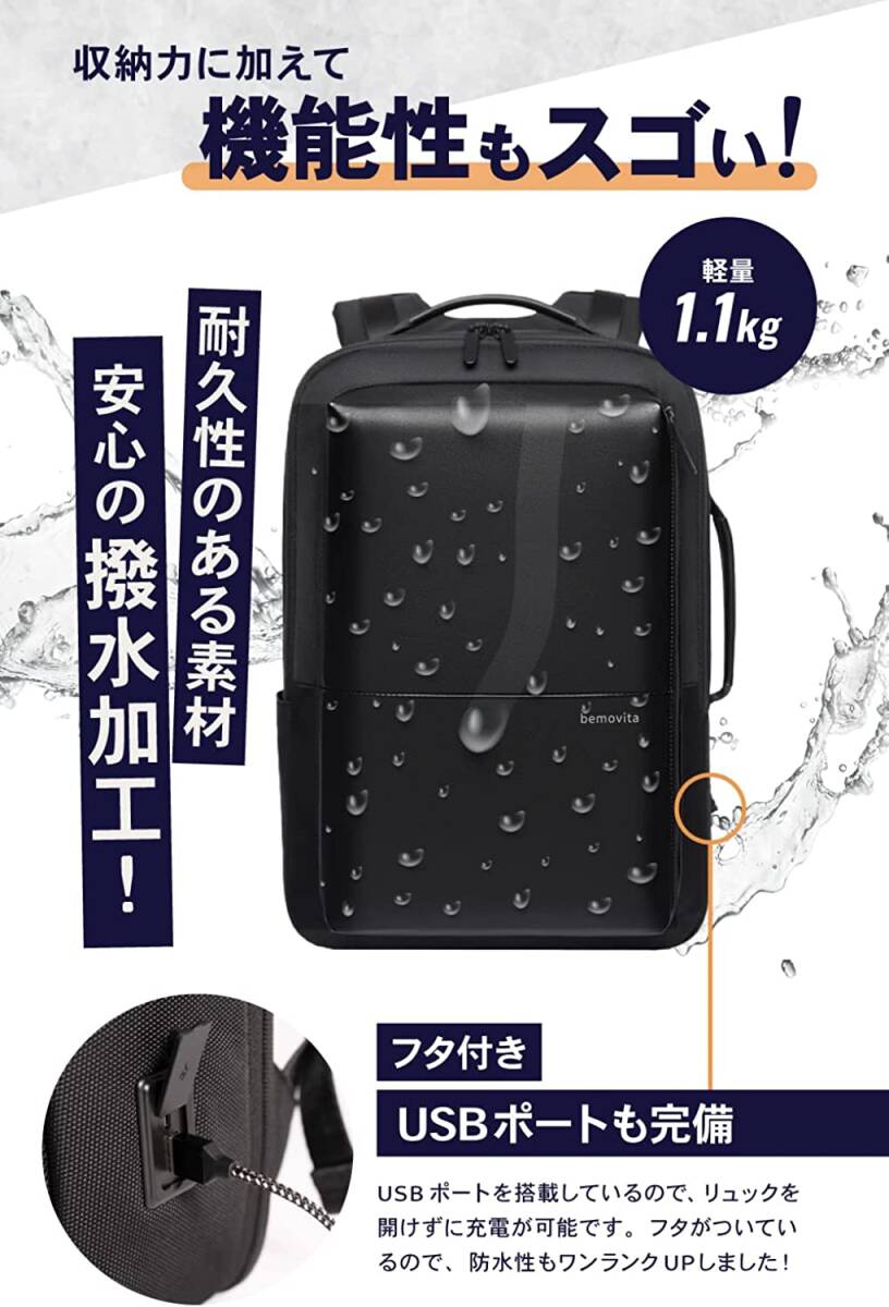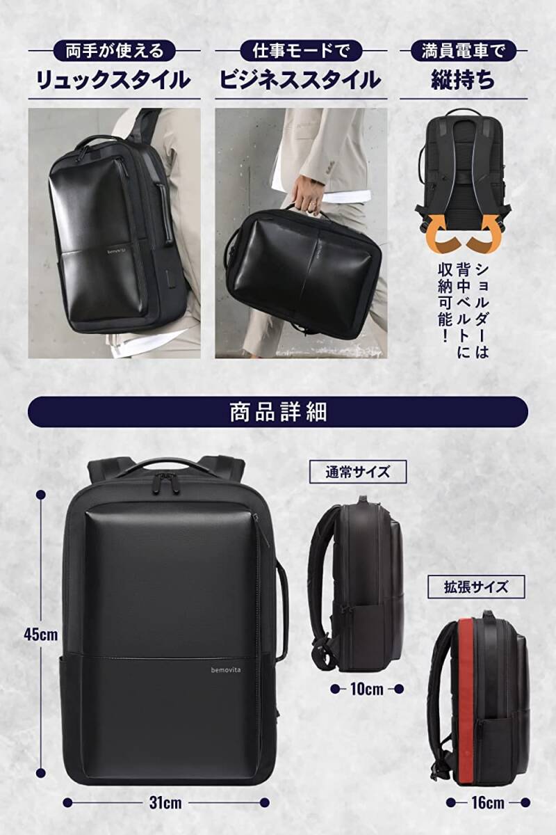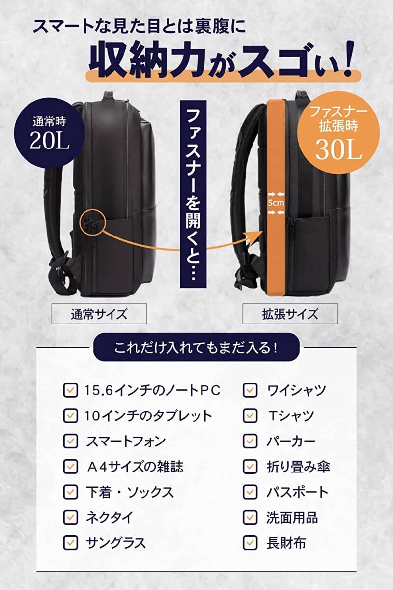 • 【スマートなのに大容量】サイズ:45 * 31 *10cm(拡張前:20L)/45 * 31 *16cm(拡張後:30L): 無駄な空間のないスクエア型にすることで内容量を最大限に高めました。マチ部分は必要時に拡張可能で普段のビジネスシーンはもちろん出張や旅行、さらに災害時の防災バッグとしても使えます。着替えやタオル・折りたたみ傘を入れるスペースも装備しているので、梅雨時期の通勤・出張バッグとしてもオススメです。短期の旅行などのときも2~3泊の着替えが楽々収納可能です。