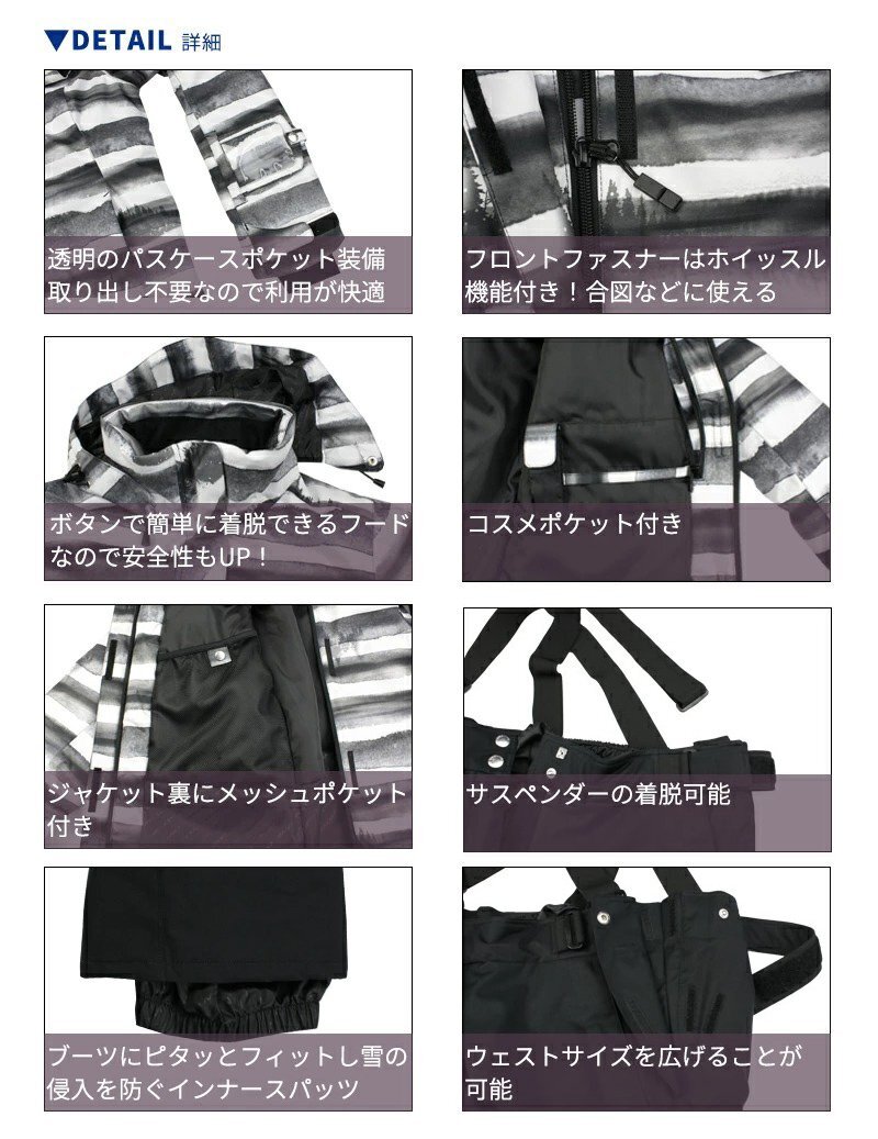 | 詳細 | 雪山の楽しさや風景をイメージしたグラデーションなボーダープリントのジャケットに シンプルカラーの上下セット。 シルエットもすっきり見える女性らしいスーツです。 高機能でポケットも充実したウェアは、スキーやボードの際もいろいろ入れられて安心です。 冬のイベントや親子でスキーや雪遊びの際にもおすすめです! あたたかく包み込んでくれるウェアで冬を思いっきり楽しみましょう。 【素材】 表地:ポリエステル100%(ポリウレタンラミネート加工) ・裏地:ポリエステル、その他 ・中わた:ポリエステル100% ・耐水圧:98kpa(10000mm) ・透湿性:5000g/m2/24hr 【機能】 【ジャケット】 ・フード取外し可能 ・フードドローコード付き ・襟裏トリコット ・あご部分トリコット ・袖パスケース ・袖口はマジックテープにて調節可能 ・リストゲーター ・裾ドローコードで調整可能 ・ファスナーはすべて安心のYKK製を採用 ・ファスナーの不快なアタリを緩和します。 ・フロントポケット2箇所 ・コスメを収納!内ポケット付 ・メッシュのゴーグルポケット付 ・フロントファスナープルはホイッスル機能付き 【パンツ】 ・ひざ立体裁断 ・パンツ裾エッジガード ・ブーツへの雪の侵入を防ぐインナースパッツ ・サスペンダー(取り外し可能) ・ポケット2箇所 ・ウエストアジャスター ・サイドウエスト調節 スノーウェア レディース 上下セット スノーボード ウェア スキー ウェア セットアップ 新作 耐水圧10000mm 雪山 雪国 防寒 防水 はっ水 撥水 レディス スノーパンツ スノージャケット シンプル 大人可愛い 上級者 中級者 初心者 セット売り セット商品 スノー アウトドア タウンユース 冬ギフト ブランド コーディネート フード付き ゲレンデ 雪遊び スキー場 旅行 冬休み おしゃれ |