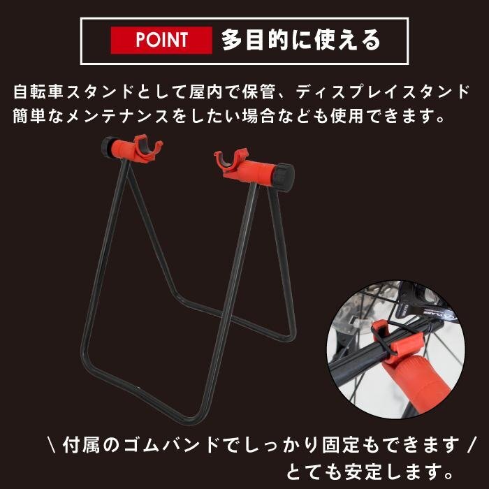| ロードバイクやマウンテンバイク、クロスバイクなどに最適な自転車1台用スタンド。 スタンドを開いた状態で、上から車体を乗せるだけで取り付けできるチェーンステーで支えるタイプのメンテナンススタンドです。 メンテナンスだけでなく室内展示、室内保管用にご使用頂けます。 メンテナンスの邪魔にならず後輪を浮かせて安定して支えてくれますので 従来のクイックで支えるものより、装着が楽になるスタンドです。 ・ゴムバンドで車体をとめれるのでとても安定します。 ・クイックに挟むスタンドが苦手な方におすすめ。 ・組立も簡単で、使わないときは折りたたむ事可能です。 本体サイズ 材質:アルミ合金 対応:20インチから700Cまで カラー:ブラック、オレンジフック 付属品:フックx2、取付ネジ キズ、汚れがある場合がございます。正常に動作しない場合がございます。ジャンク扱いでお願いします。ノークレーム、ノーリターン | |