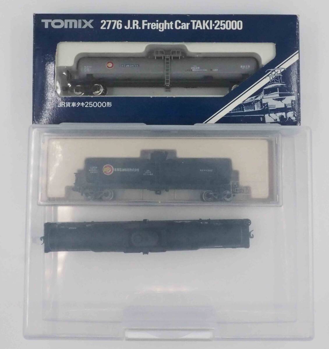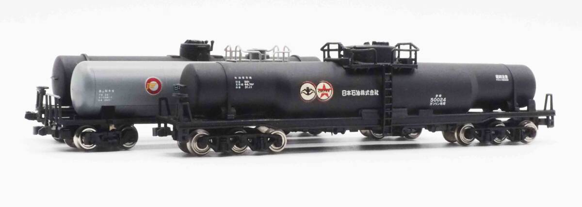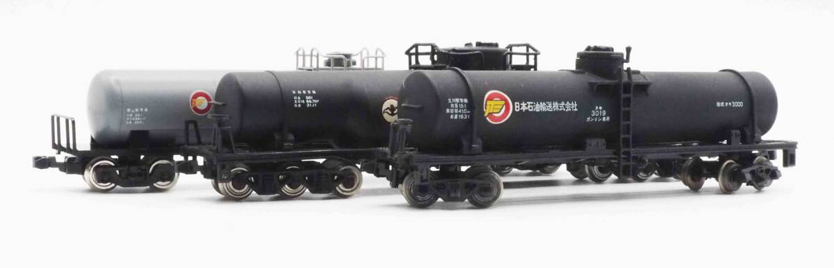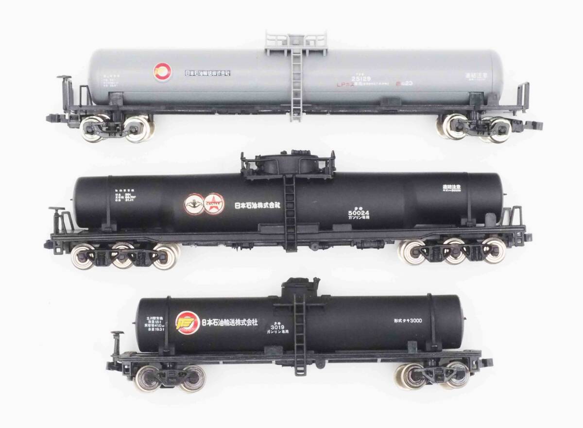 TOMIXタキ25000、KATOタキ3000及びTOMYタキ50000 計3両セットです。タキ3000のハシゴの片側が折れています。カプラーはKATOカプラー自連型に変えています。一部の元箱はありませんので写真のプラケースに入れて送らせて頂きます。