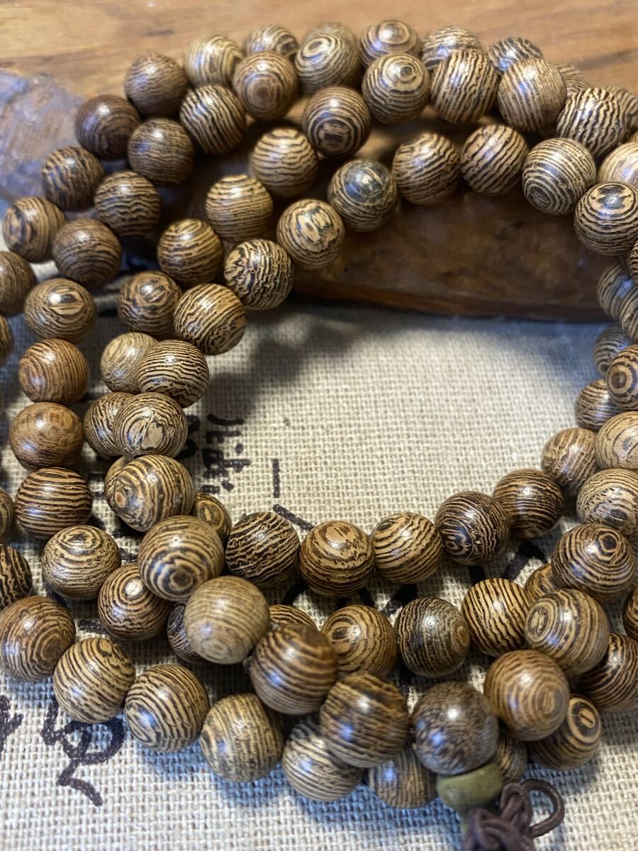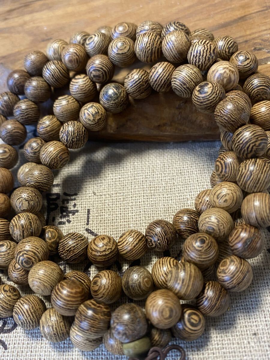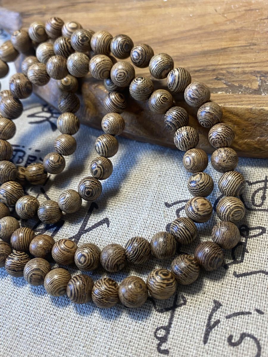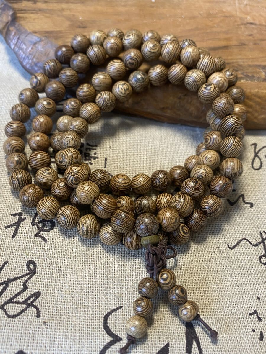 手作りの木製数珠、茶色の丸型ビーズが特徴で、宗教的な儀式や瞑想に最適。