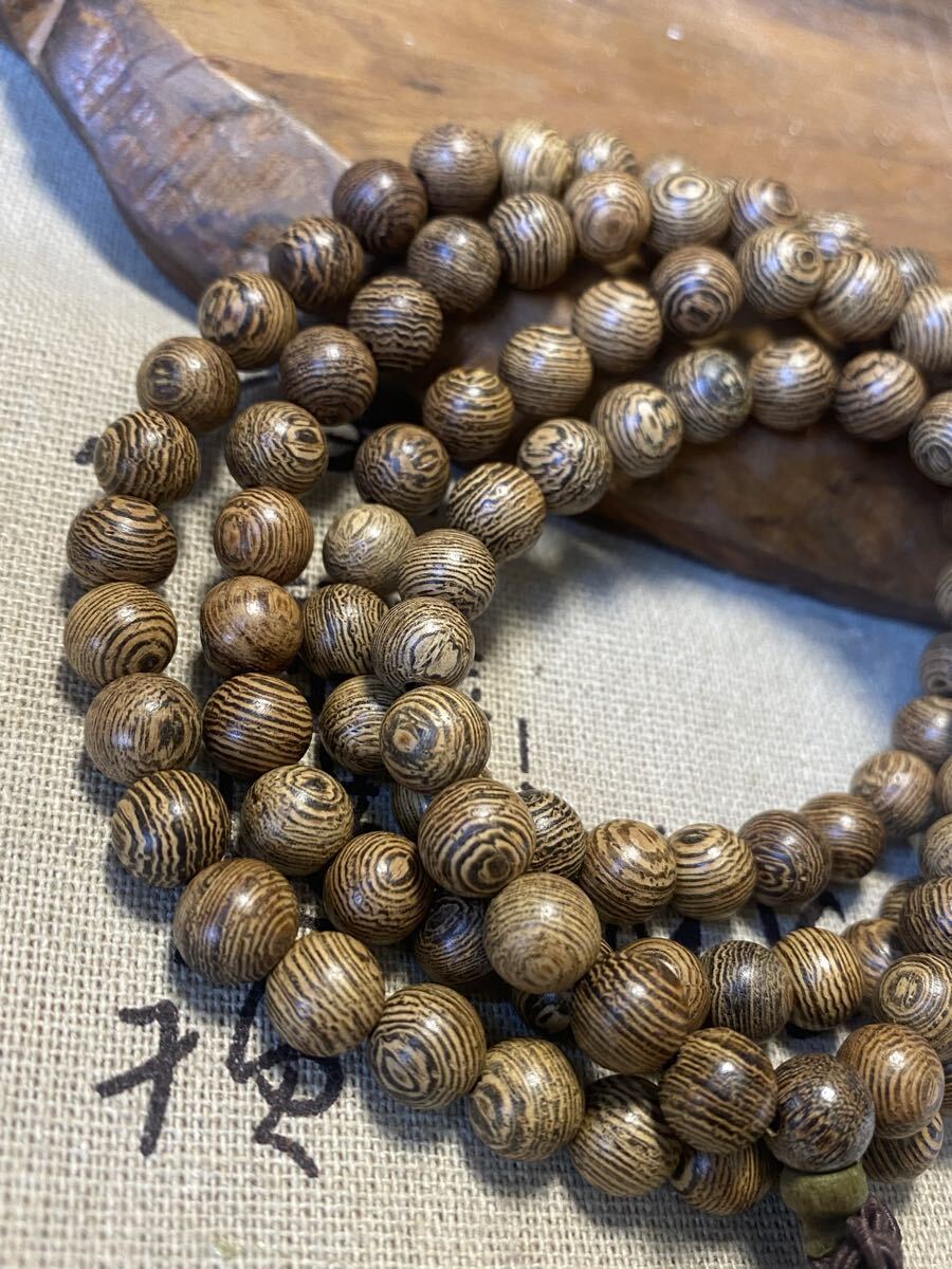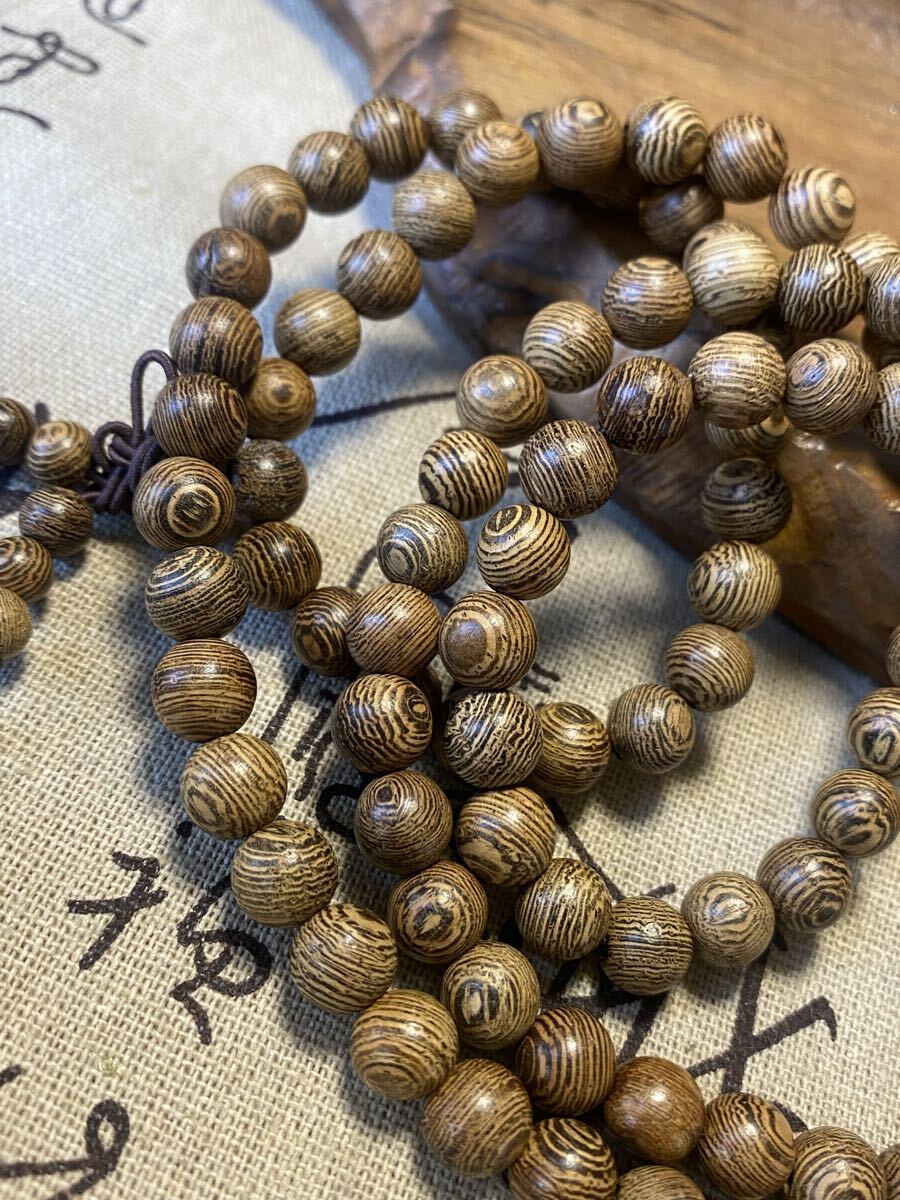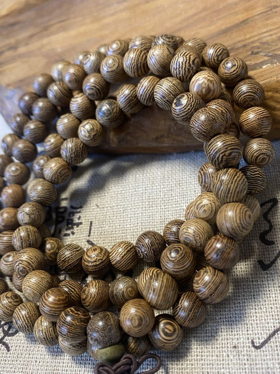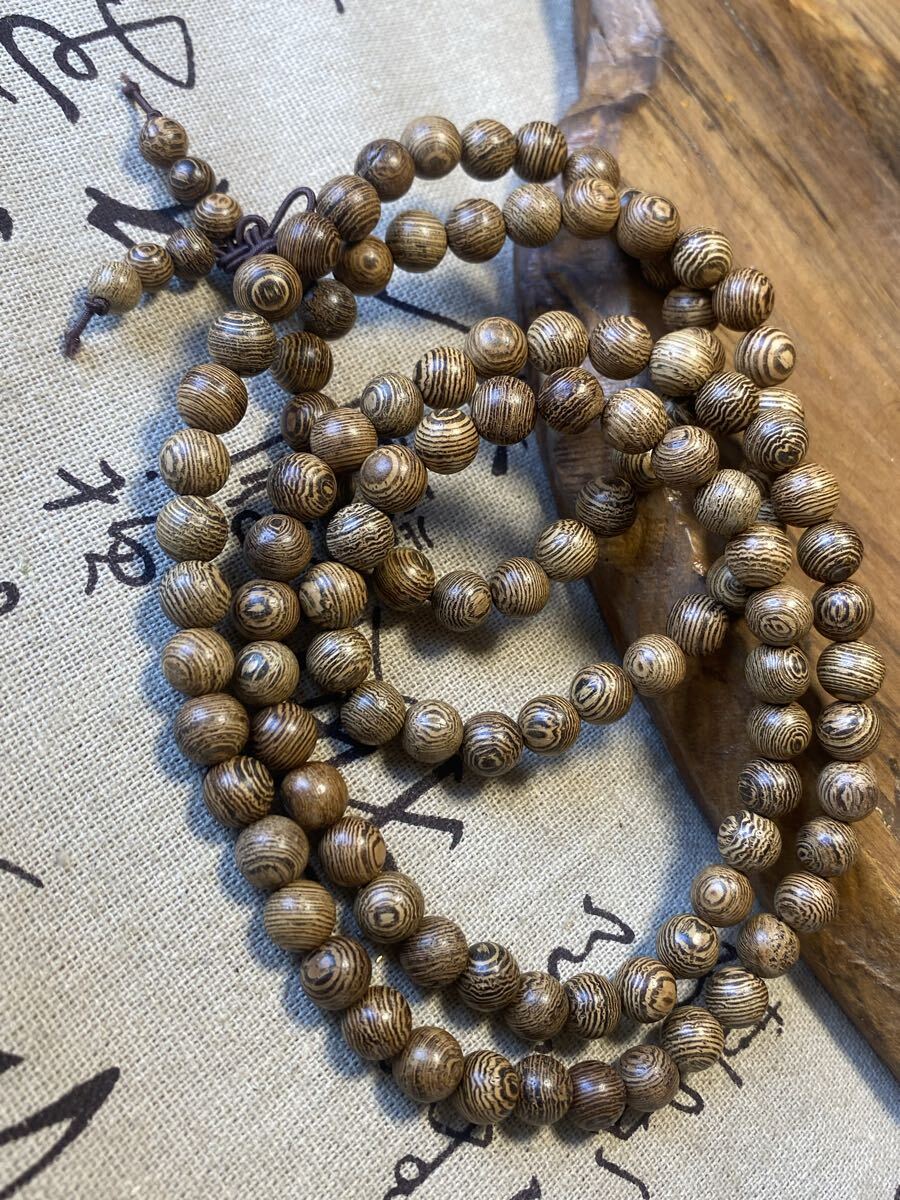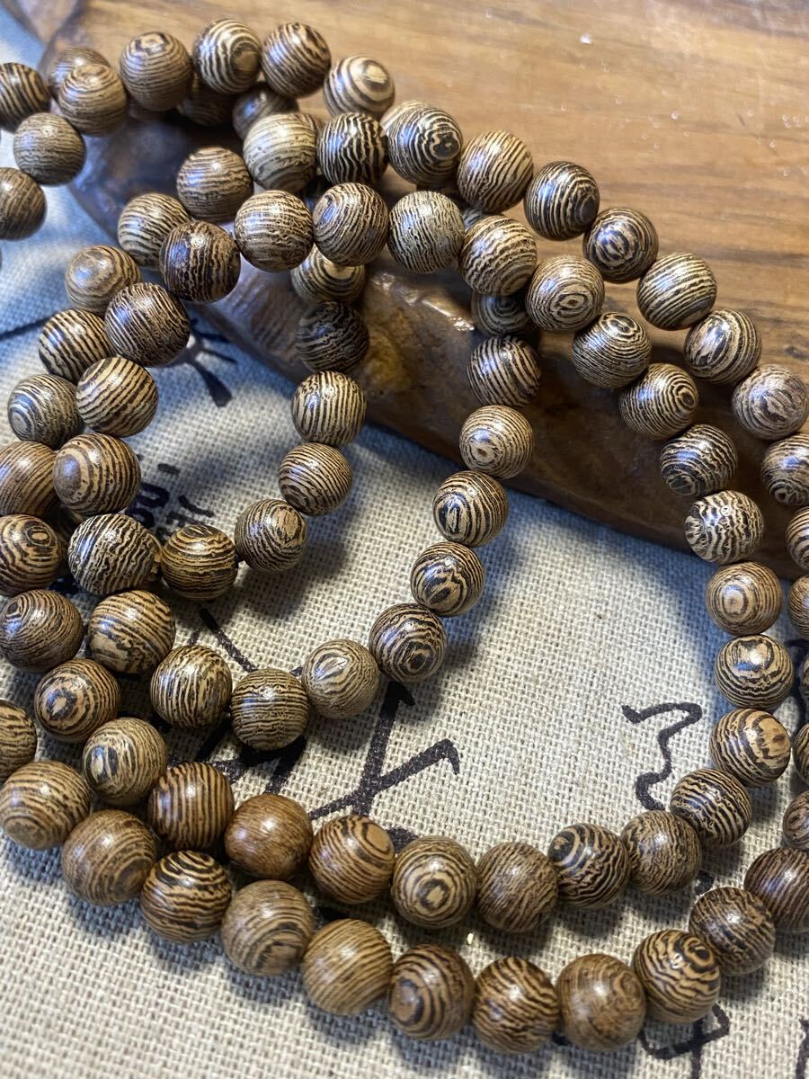 手作りの木製数珠、茶色の丸型ビーズが特徴で、宗教的な儀式や瞑想に最適。