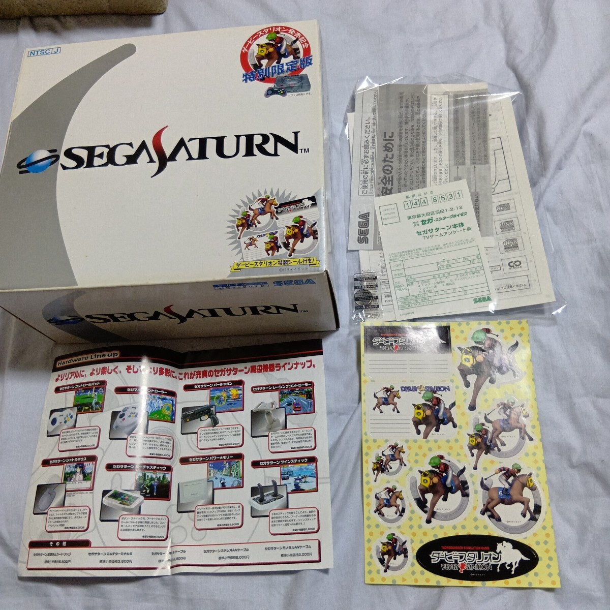 This is a brandnew SEGA SATURN console(Derby Stallion limited edition) w/controller, power cord, AV cable and Manuals. I bought it back in 1998 and keep it unused. Derby Stallion Software disc isn't included.only sticker is included. 4 Software Discs, 2 modems, Virtua Fighter2 XBAND card.