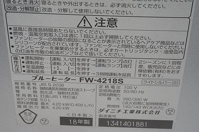 ●◎ ※ジャンク DAINICHI ダイニチ ブルーヒーター 石油ファンヒーター 5.0Lタンク付(青キャップ) 100V 2018年製 FW-4218S ●