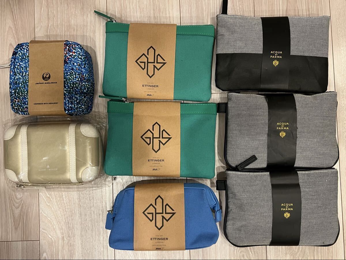ビジネスクラスアメニティーの8個セットです。新しいものから古いものまでありますが、全て未開封です。何が入っているか分かりませんが、裏面写真でご確認ください。