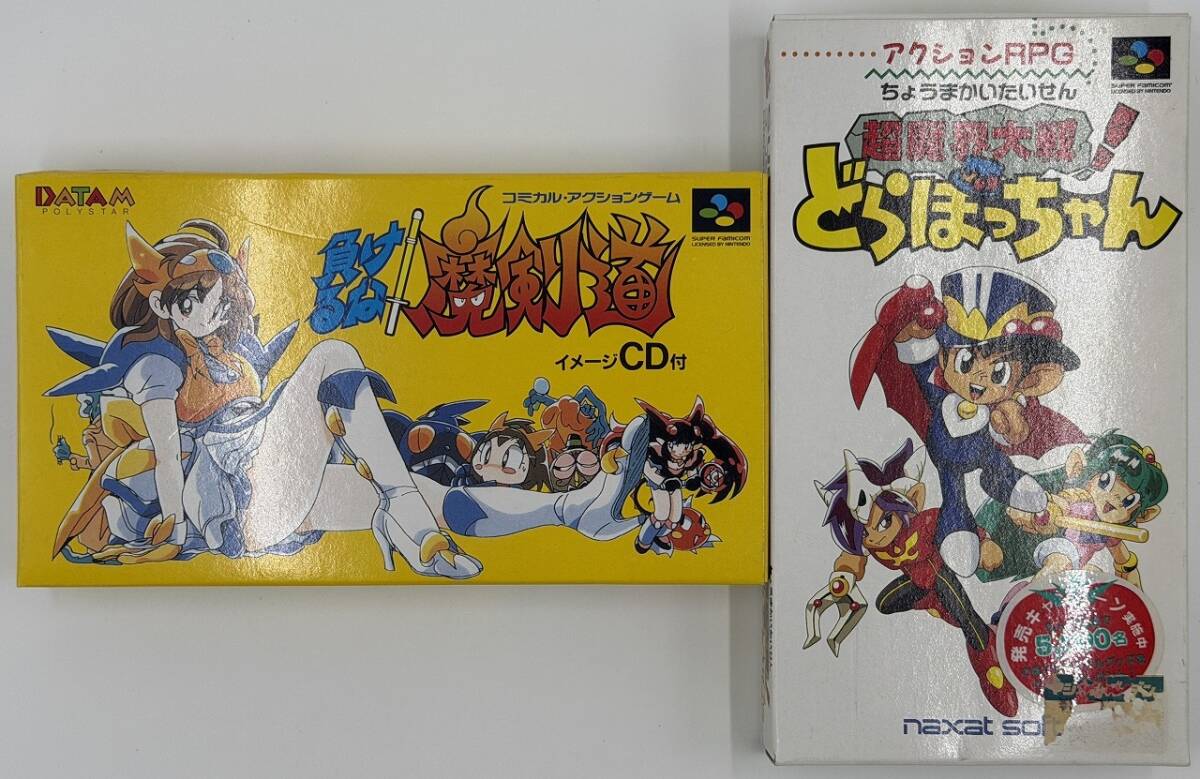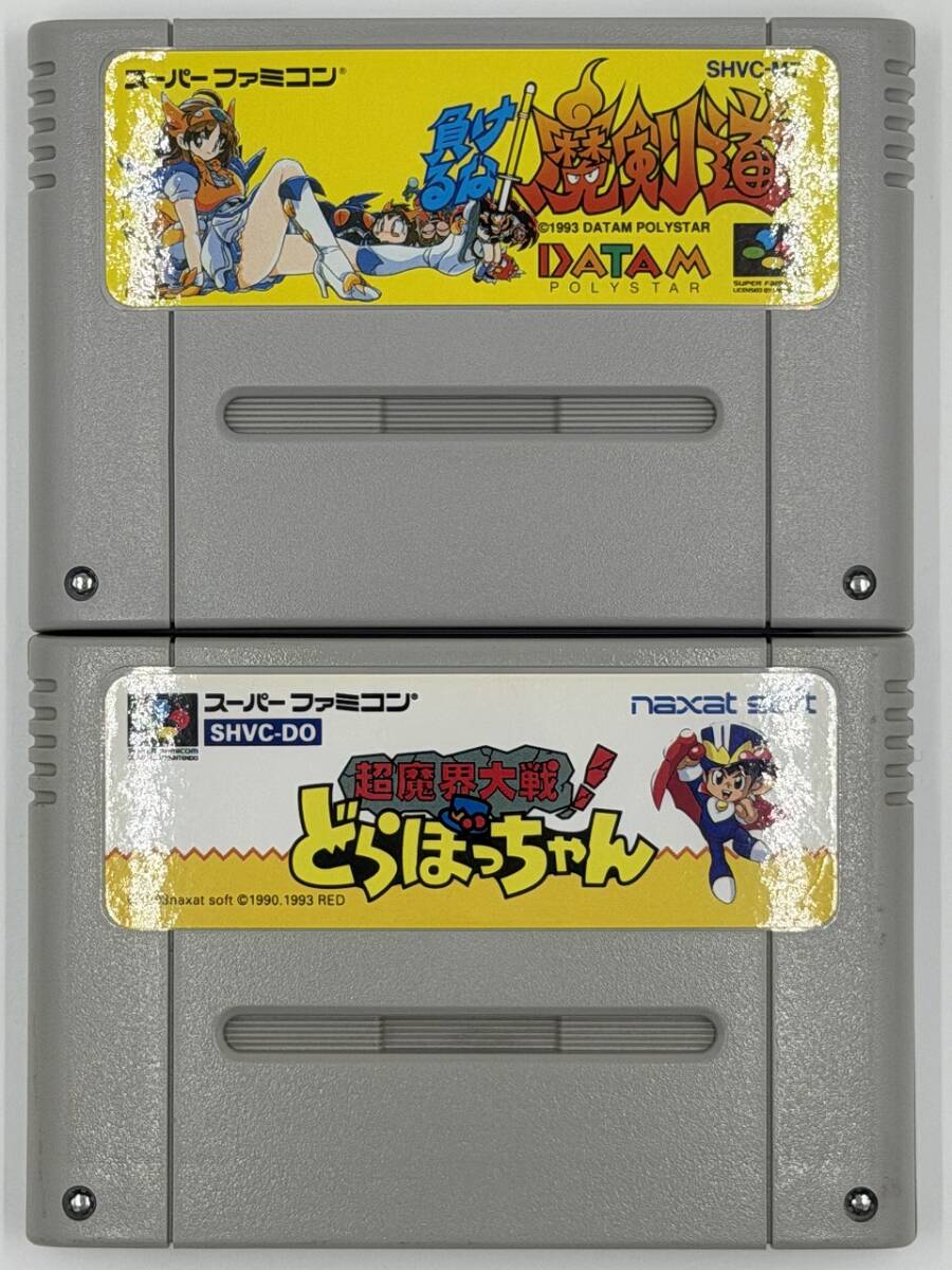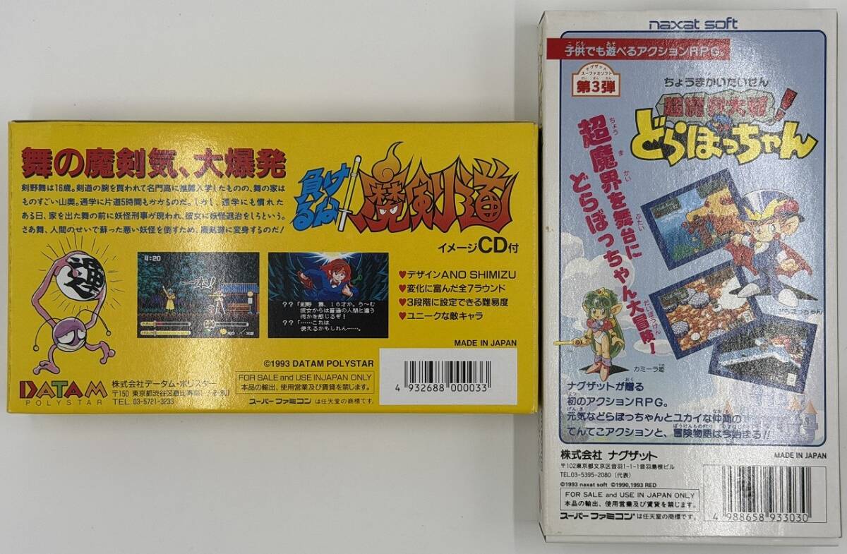 DATAM POLYSTAR:負けるな! 魔剣道 & naxat soft:超魔界大戦! どらぼっちゃん SFCカセット2種SET 箱付き中古