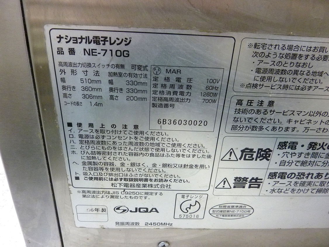 | 商品説明 | ナショナルの業務用電子レンジ NE-710G です。 |