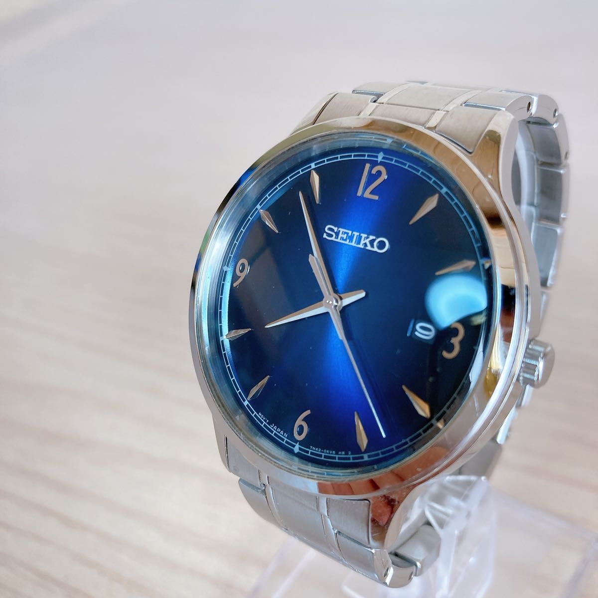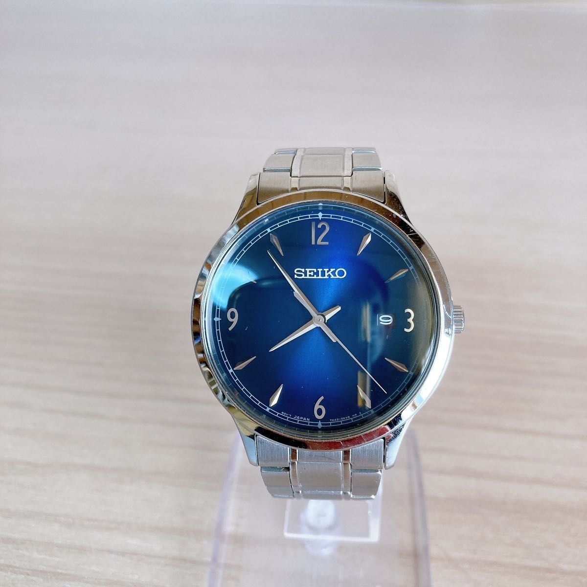 青い文字盤とステンレススチールのケースを持つSEIKOのクォーツ腕時計。
