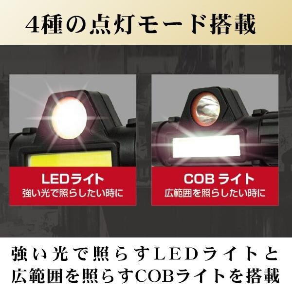 強い光で照らすLEDライトと広範囲を照らすCOBライトを搭載。