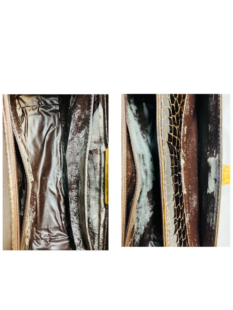 バッグ内サイドポケット部分含めベタつき、剥がれ跡があります(画像10)