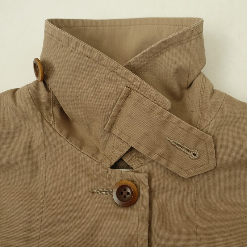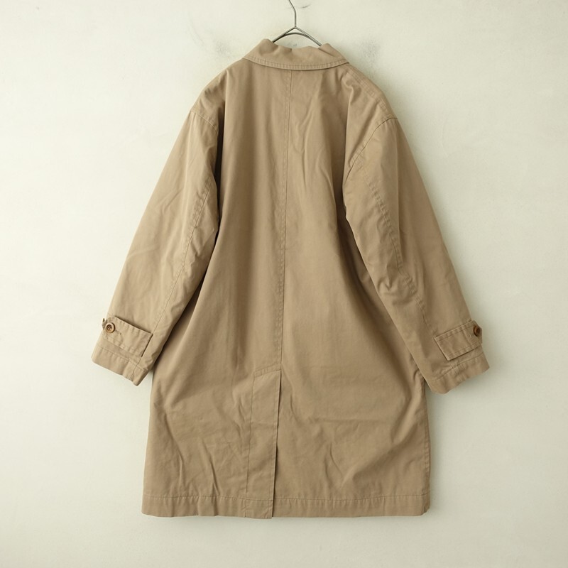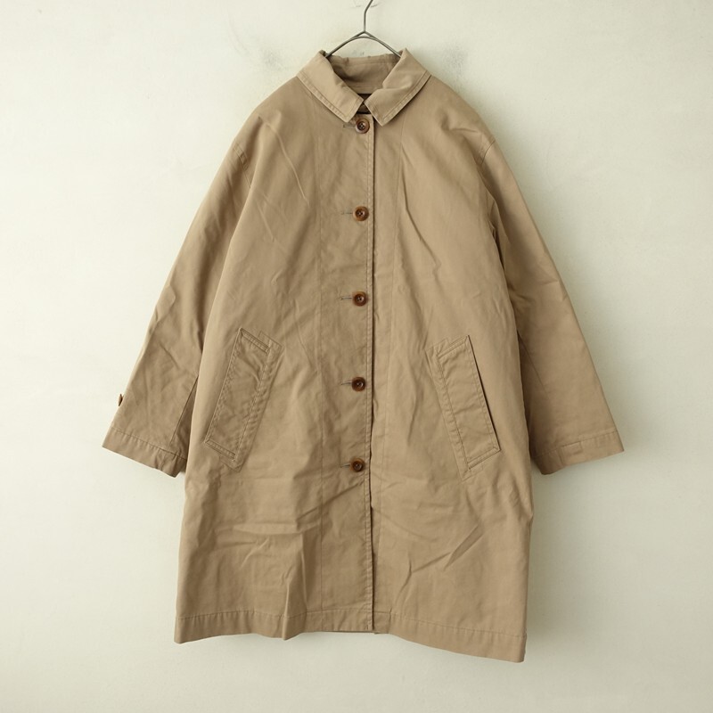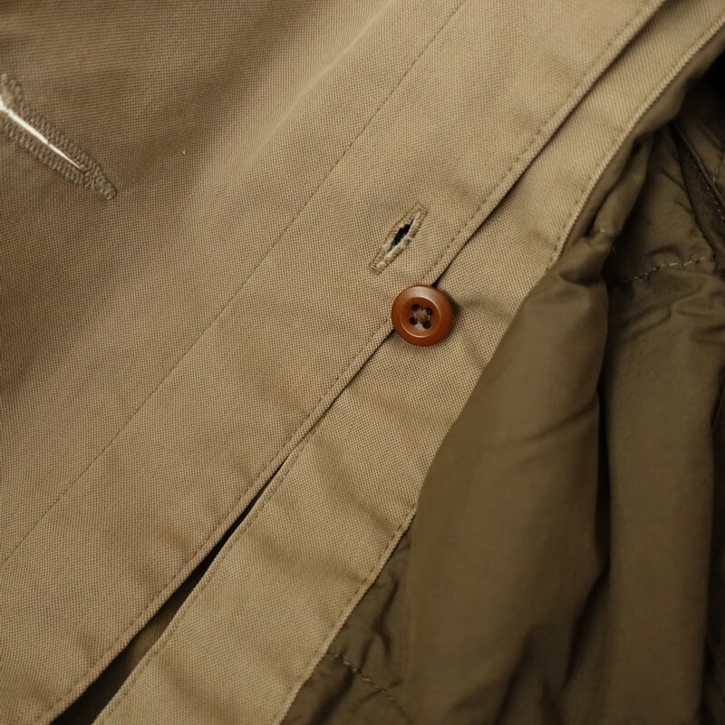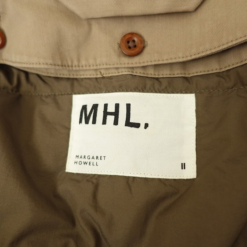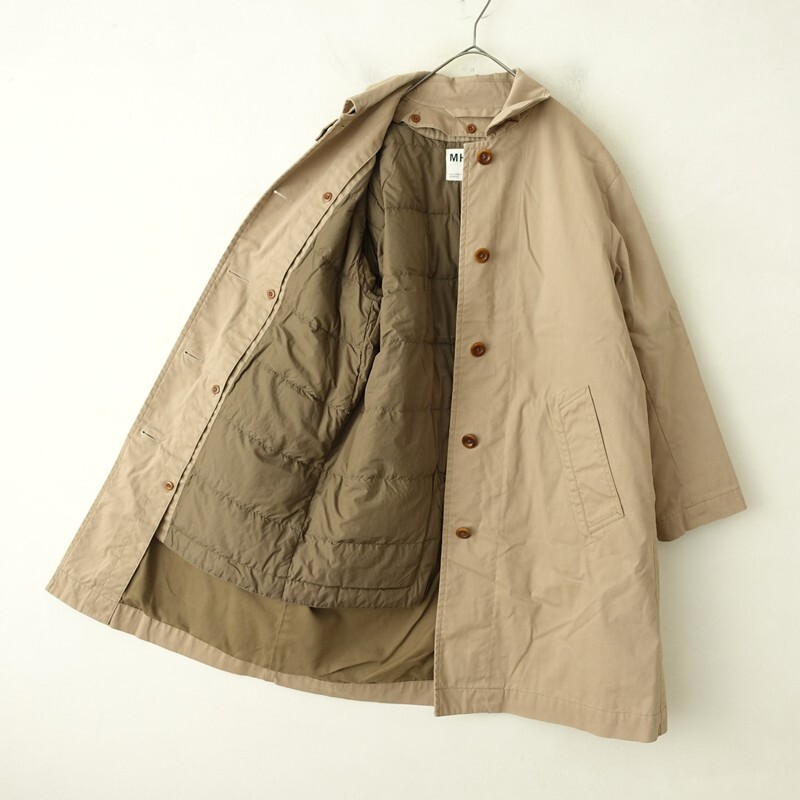 | MHL.のダウンライナー付きステンカラーコートです。カラーはカーキベージュです。コットンナイロンの織り生地を使用。裏地付きで仕立てられています。着脱可能のダウン入りライナーがあしらわれております。チンタブ付きのステンカラーコートです。袖口はアジャストタブ・ボタン付き。バックはセンターベント入り。ライナーには左胸に内ポケットを配し、本体は前両腰にポケットがございます。 |
