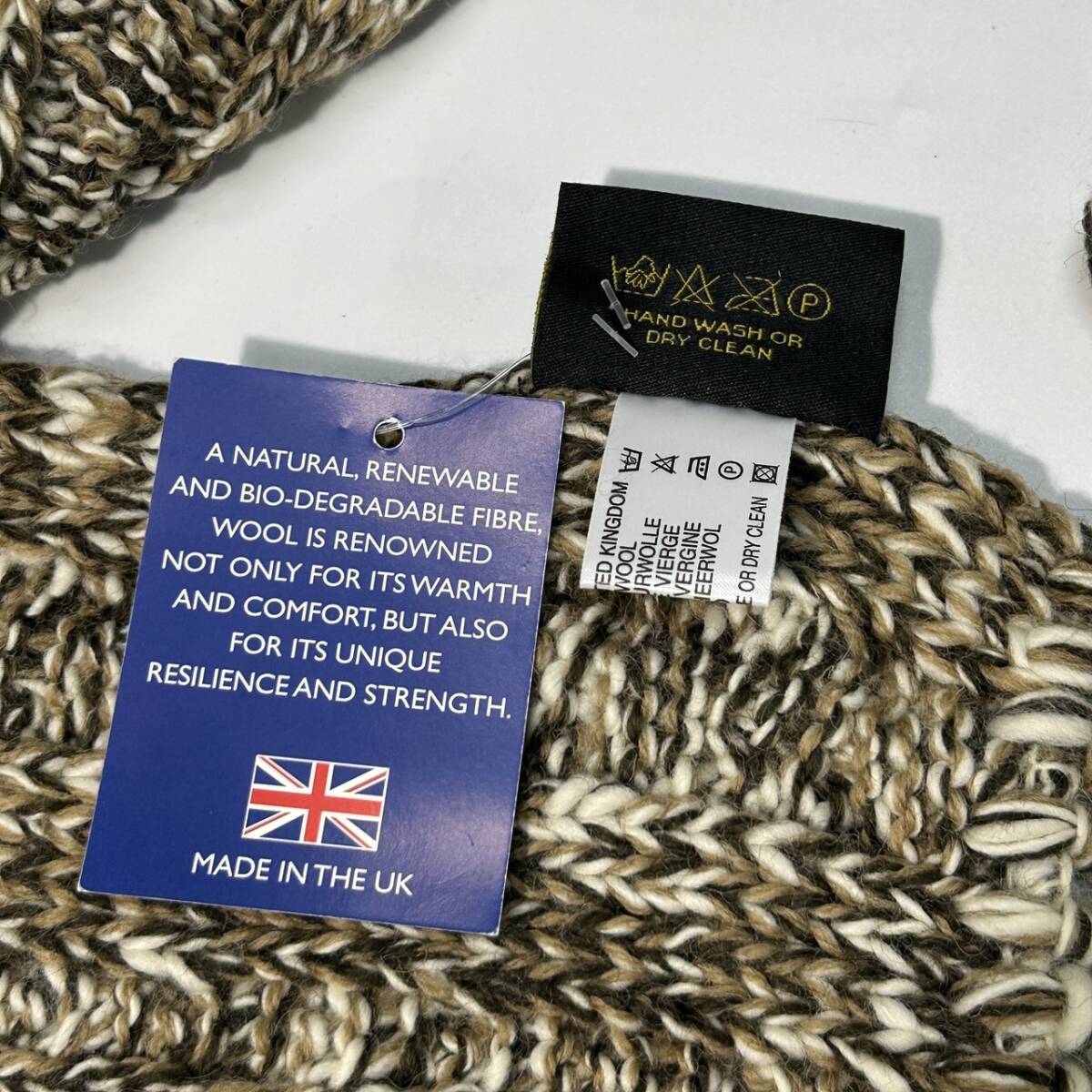 イギリスの老舗ニットメーカー「HIGHLAND 2000」の製品で、英国羊毛を使用し、伝統的なハンドフレーム製法で丁寧に作られています。ざっくりとした立体感のある編み目と、深みのあるカラーが特徴です。