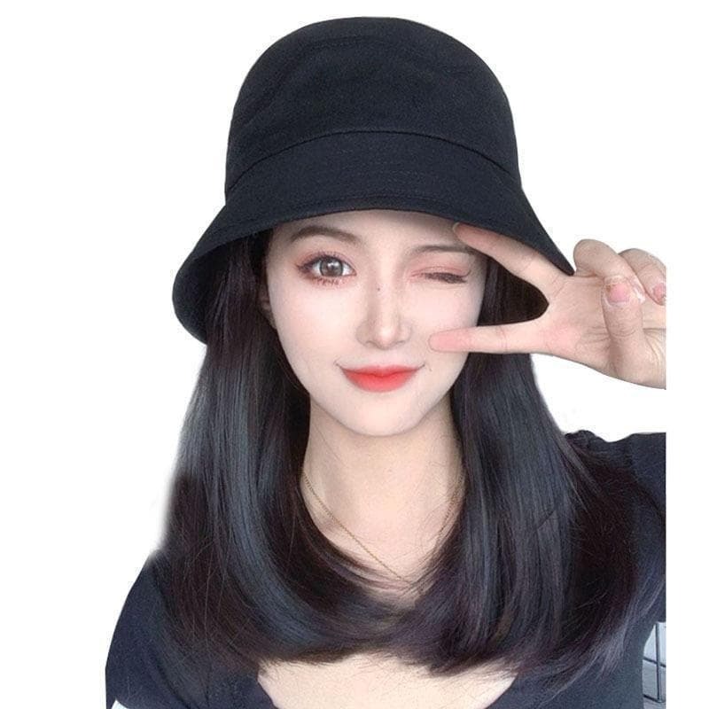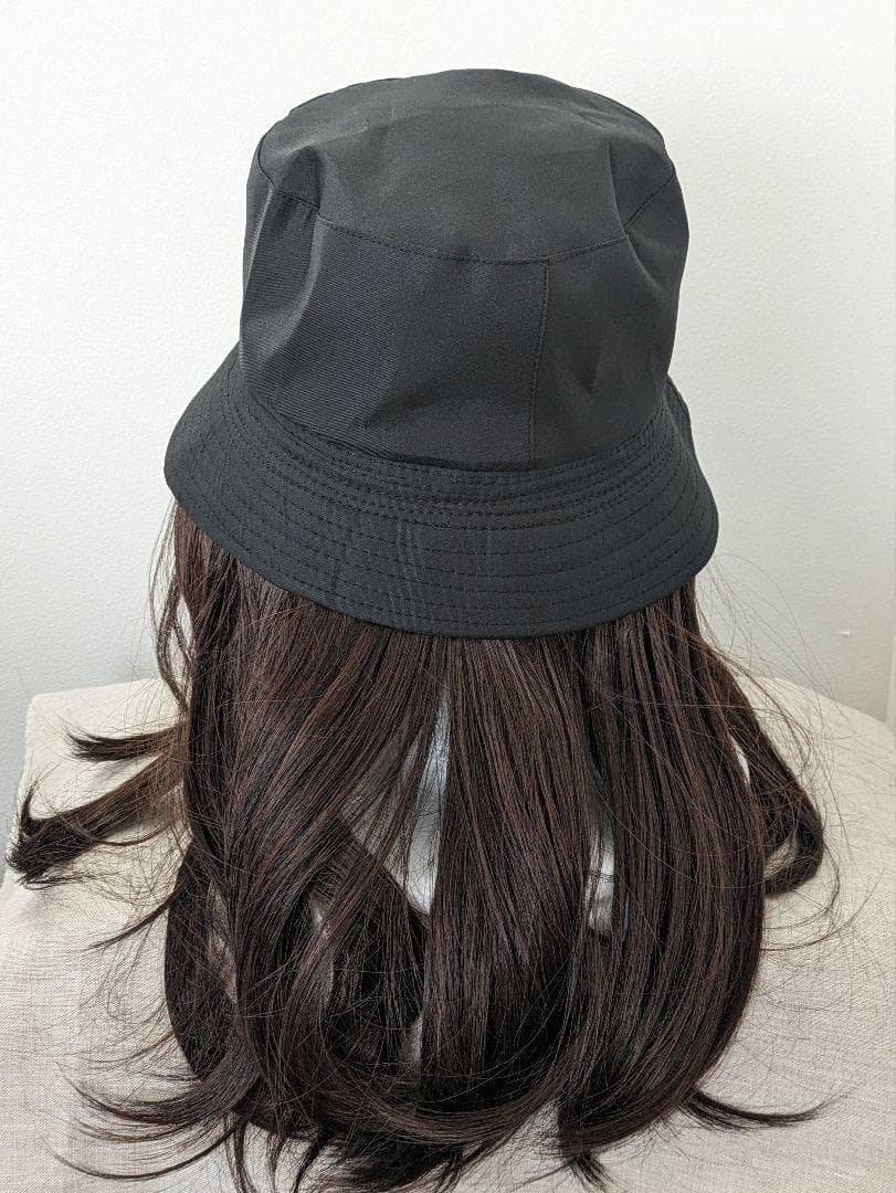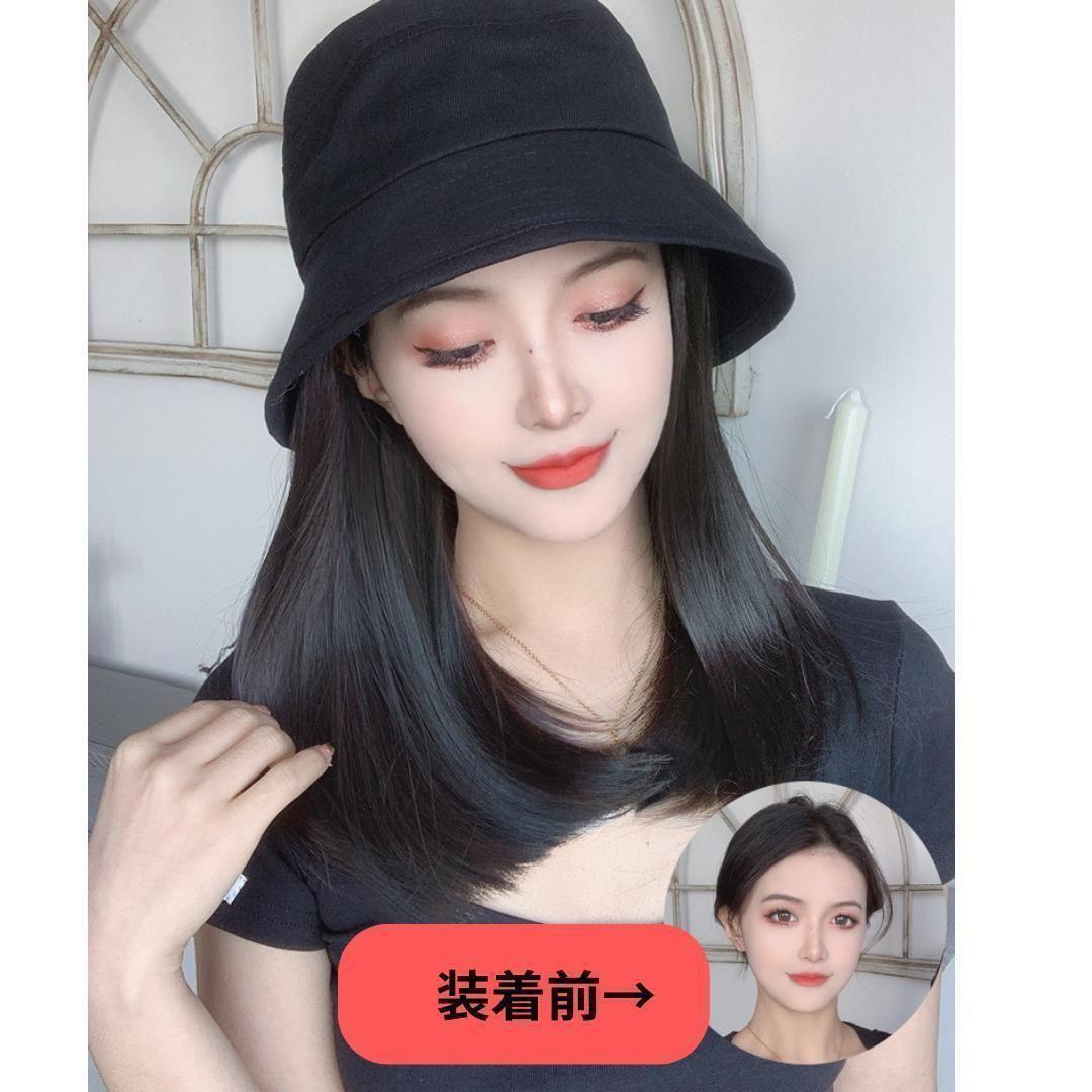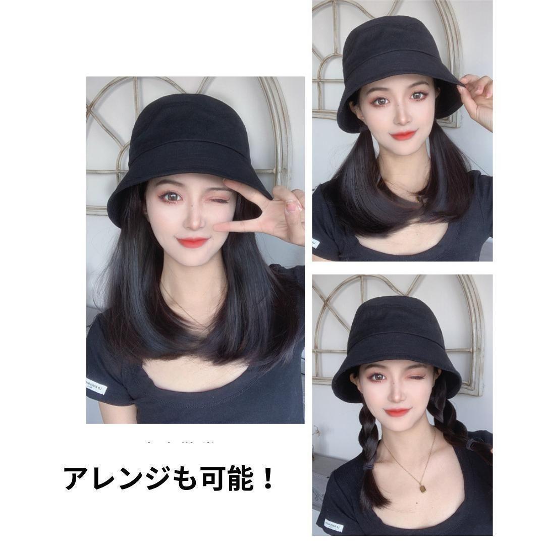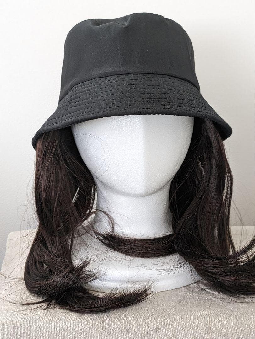 帽子をかぶるだけで手軽にヘアーチェンジ!ストレートの少し内向きカールのミディアムヘアーなのでアレンジも可能!写真のように緩く結んだりみつあみしたり簡単なので変装したいときや気分転換にもおすすめです。帽子バケットのカラーはブラックで合わせやすいので長く楽しめます。