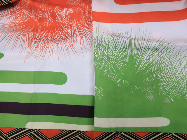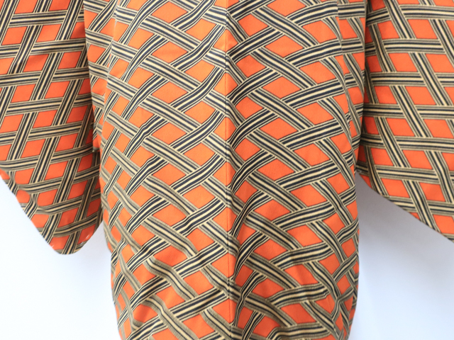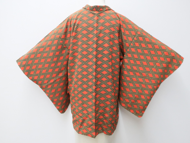 リサイクル商品のため、羽裏に薄汚れがございますがご着用いただけると存じます。 地色は、朱色です。 1枚目の画像が近いお色かと思われます。 素材は正絹です。 |