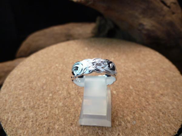 リング一周にプルメリアと波がモチーフになった彫刻が綺麗にデザインされています。
