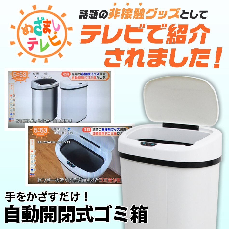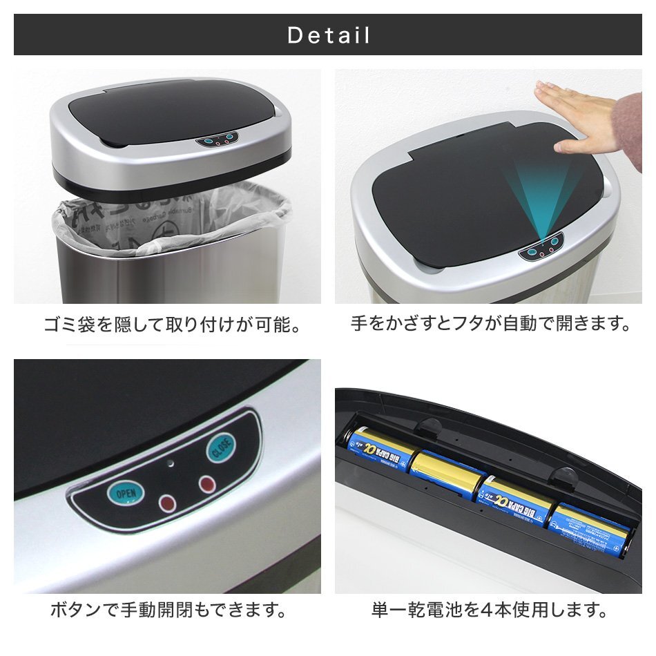 とっても便利! センサーでフタが自動開閉! 手をかざすとセンサーが感知してフタが開きます。 直接手を触れずに開けられるので、とっても衛生的です! 台所はもちろんのこと、赤ちゃんのおむつ捨て、医療の現場にもぴったりです! 手動で開閉OK! 操作パネルには、センサーの他に手動で開けたり閉じたりできるするボタンが付いています。 大容量な48Lタイプでシンプルなデザイン。 キッチンやリビングなどに置いてもマッチしやすいです。 【商品仕様】 内容:本体 ×1 カラー:ブラック 容量:48L サイズ:(約)幅40cm×奥行き27.5cm×高さ64.5cm 重量:(約)3kg 使用電池:単一電池×4(別売) 素材:スチール、ステンレス、ABS 他 【注意事項】 ※本商品には電池は付属しておりません。 ※紙のゴミ袋には対応しておりません。 ※商品は、モニターによって色合いが異なって見える場合があります。 ※仕様・デザインは改良のため予告なく変更することがあります。 |