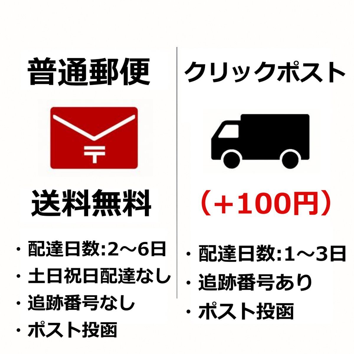 普通郵便は土日祝日は配達がされない為、お届けまで2~6日程度かかりますのでお急ぎの場合はクリックポストへの変更がおすすめです。