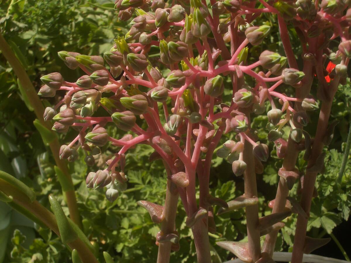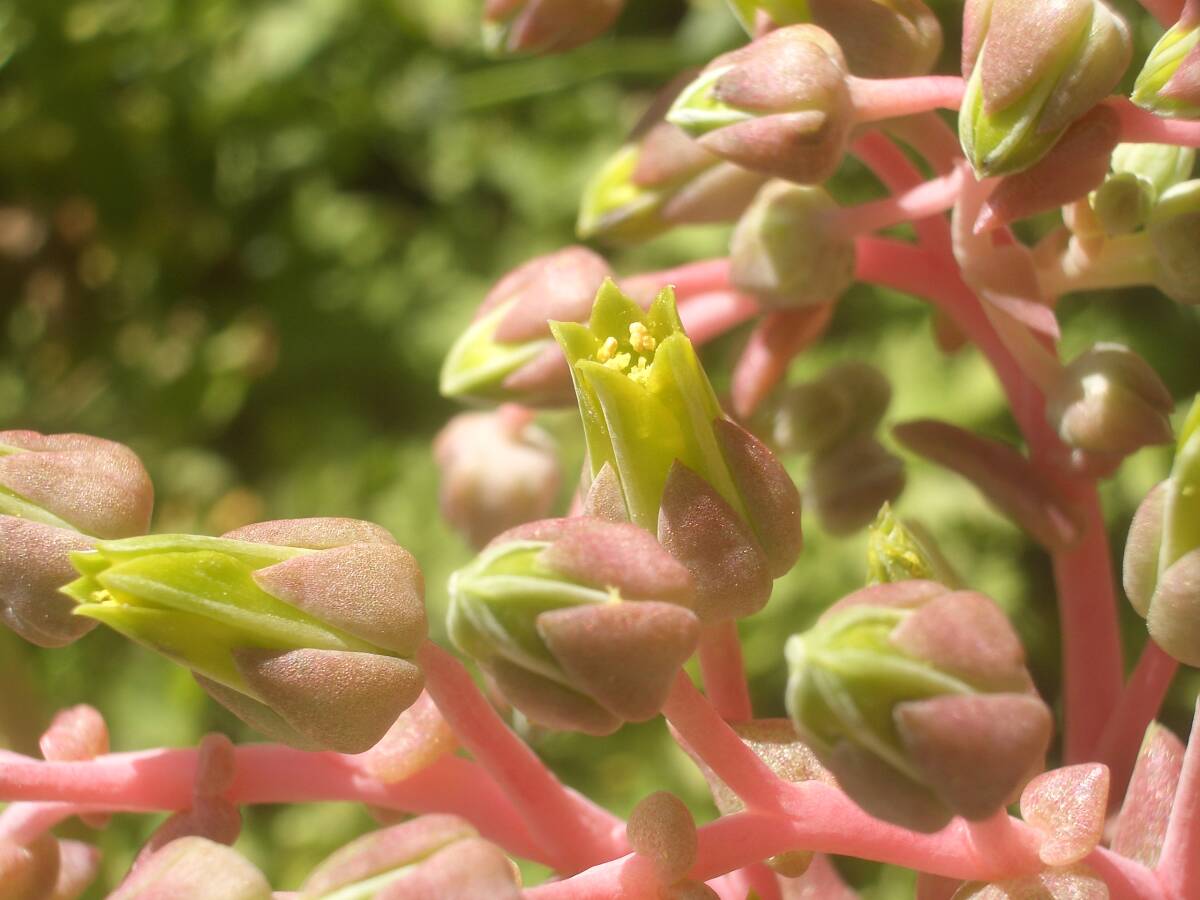 赤い花茎と黄緑の花が特徴的なダドレア。