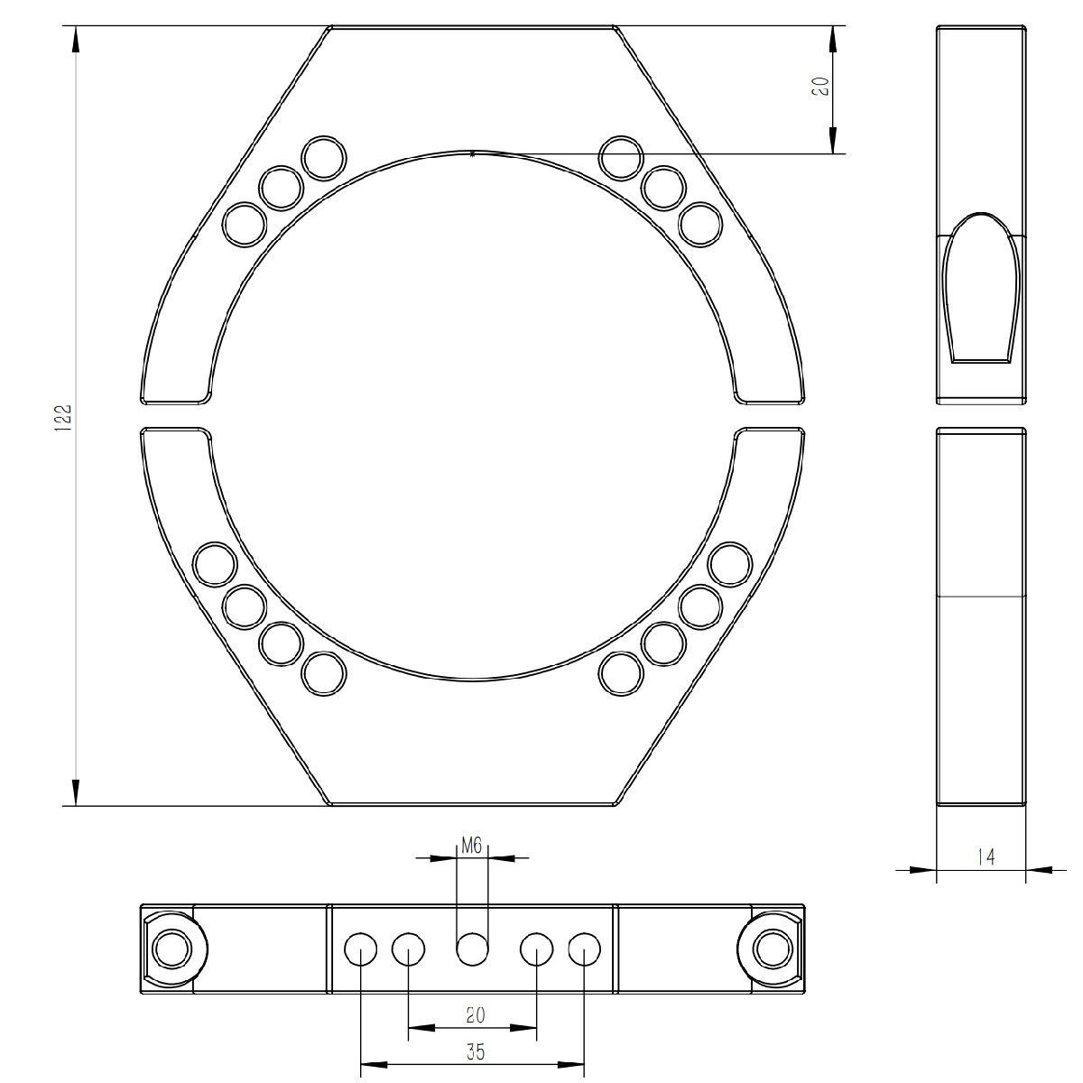 ネジ穴仕様:M6ネジ穴を真ん中1箇所、20mmピッチ2箇所、35mmピッチ2箇所