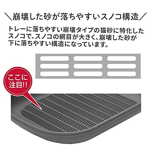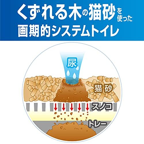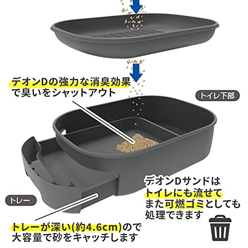 商品紹介 従来のシステムトイレと違い、シーツを使わない新しいシステムトイレ。シーツを使わず砂だけなので、お手入れは砂の入れ替えのみで簡単で、消耗品が1つのだけなので経済的です。スノコの網目が大きく崩壊した砂が落ちやすく、スノコの端にもたまりにくいです。専用のスコップも網目にぴったりになっていて楽々お掃除。トレーも大容量で深いので、砂がこぼれにくいです。 使用上の注意 ●本品は猫用です。猫以外には使用しないでください。 ●本品は室内用です。屋外では使用しないでください。 ●人やペットが破片等を誤飲しないように注意してください。万 一、誤飲した場合は各医師に相談してください。 ●空袋は幼児・子供・ペットがおもちゃにしないように注意してく ださい。 ●本品を移動させる場合は、猫が中にいないか確認し、底から 持ち上げてください。 ●トレーがしっかり閉じていることを確認してご使用ください。 ●本品は必ず水平で安定した場所に設置してください。 ●人が本品に乗ったり、座ったりしないでください。 ●破損した場合は直ちに使用を中止し、新しい製品に買い替え てください。 ●床面の材質によっては、キズ・跡等が残る場合がありますの で注意してください。 ●「デオンDサンド」の注意事項に従って正しく使用してください。 ●密閉した部屋で本品を使用する場合は、換気を十分に行ってく ださい。 ●専用爪付スコップは用途以外には使用しないで下さい。 ●猫が嫌がる場合は無理に使用しないでください。 ●火気のそばでの使用や保管はしないでください。 ●幼児・子供・認知症の方・ペットのふれない所に保管してください。 原材料・成分 本体・スコップ:ポリプロピレン デオンDサンド:木粉・おから・デオンD・抗菌剤 使用方法 (使用方法)1ペティオシステムトイレの上に本品を5~7cmの厚さになるように敷きつめます。2猫砂をスノコに入れた際、粉末がトレーに落ちる場合がありますが。消臭効果がありますので捨てずにご使用ください。3ウンチ等で汚れた猫砂は、スコップで取り除いてください。尿を吸収した砂が落ちない場合は専用スコップでかき混ぜ、下に落としてください。2尿を吸収すると崩れてトレーに落ちますので、猫砂が少なくなったら、新しい猫砂を補充してください。(流す場合)猫砂はトイレに流すことができます。この場合、1回に流す量は約100mL以下にしてください。大量に流すと配水管が詰まる原因となります。(燃やす場合)使用後は可燃ゴミとして処理できます。 ★愛猫の性格・性質等をご理解のうえ、お選びく ださい。 ★猫砂は天然素材を使用しているため、色に多少 のバラツキがあります。 ★猫砂の製造工程上、形状・サイズ等に多少のバラ ツキがあります。 ★猫砂開封後は封をして直射日光・高温多湿の場 所をさけて保管してください。 ★商品の仕様は予告なく変更する場合がありま す。 ★廃棄する場合は、各自治体の指示に従ってくだ さい。 ★品質管理には万全を期しておりますが、お気 づきの点がありましたらお客様相談室まで お問合せください。