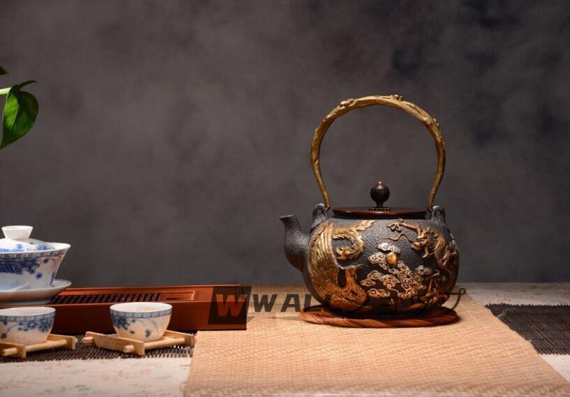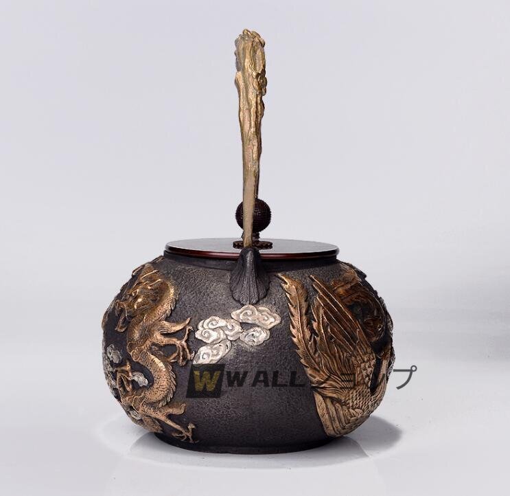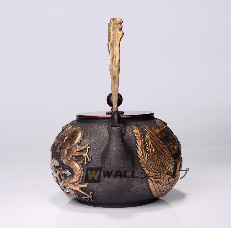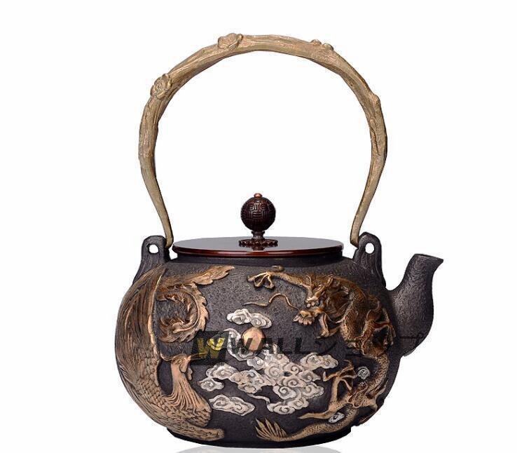 極上の★竜と鳳凰 鋳鉄製鉄瓶 手作り コーティングなし 老鉄瓶 やかんを沸かす 提梁鉄瓶 お茶の道具 1.2L