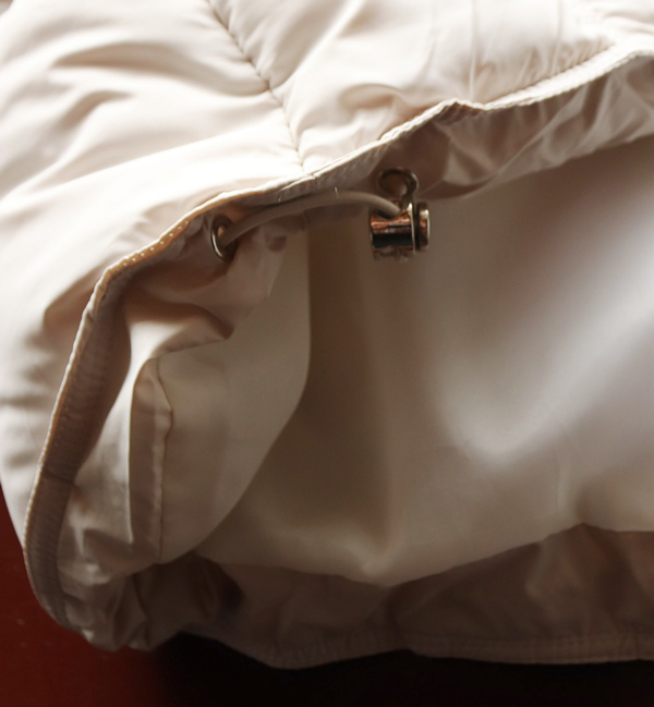 フード仕様の際は、ドローコード付きですっぽり頭に。