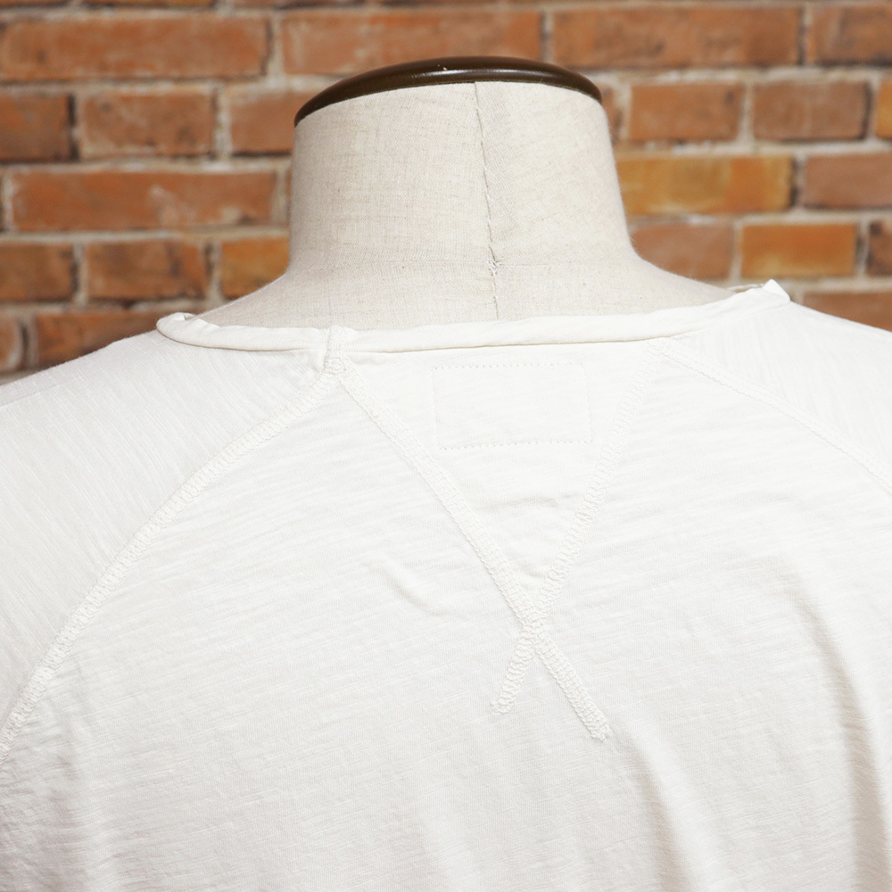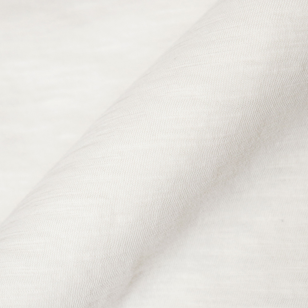 オーガニックコットン100%のスラブジャージーを使用した長袖Tシャツ。スラブ糸の自然な凹凸が生む軽やかな肌触りと、ヌケ感のある表情が魅力です。クルーネックにラグランスリーブを組み合わせ、肩まわりにゆとりを持たせつつも、すっきりとしたシルエットに仕上げています。