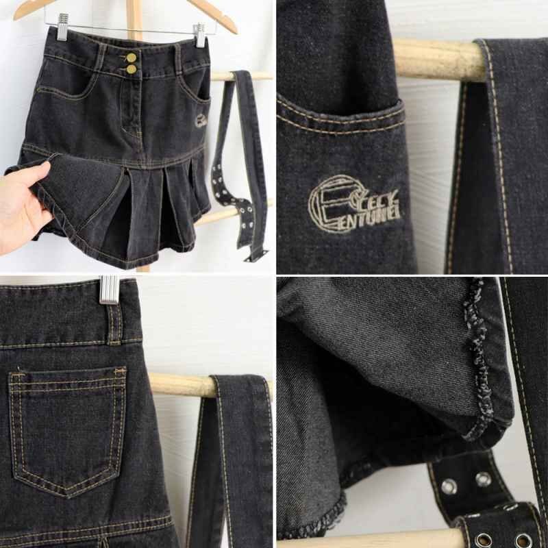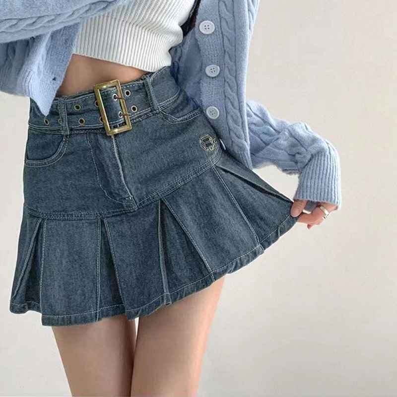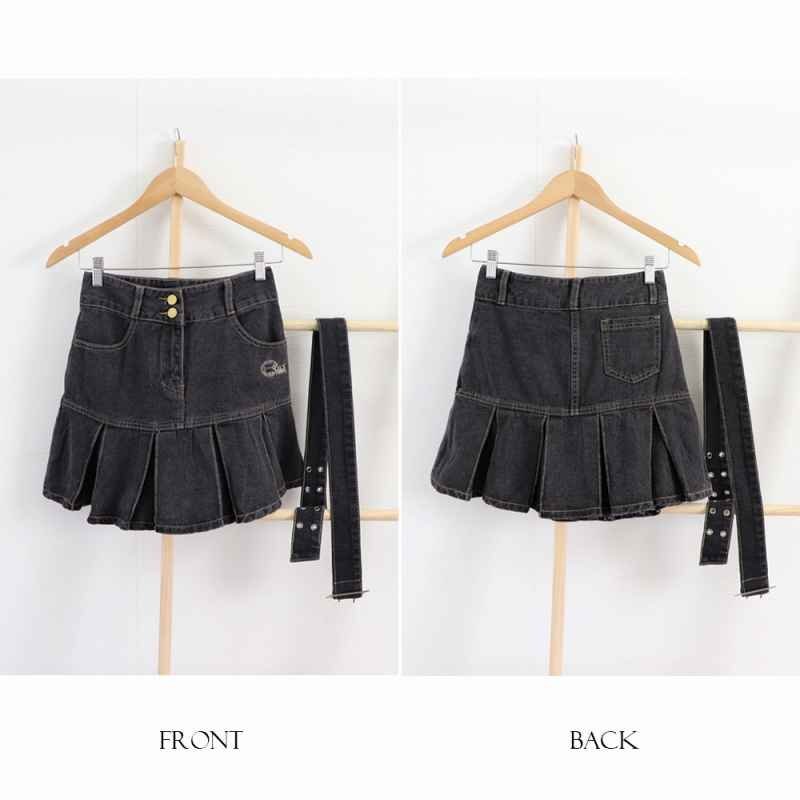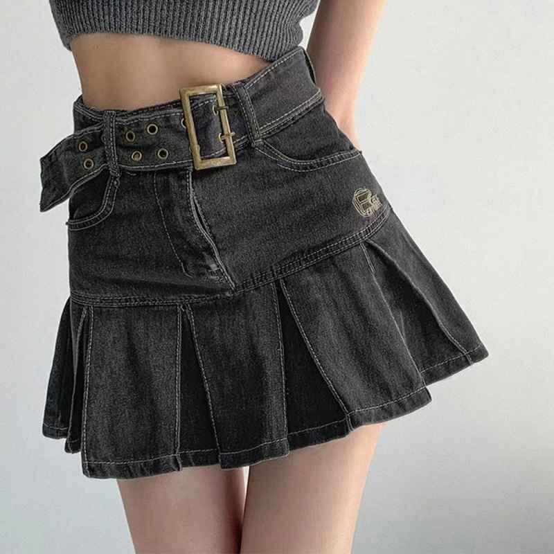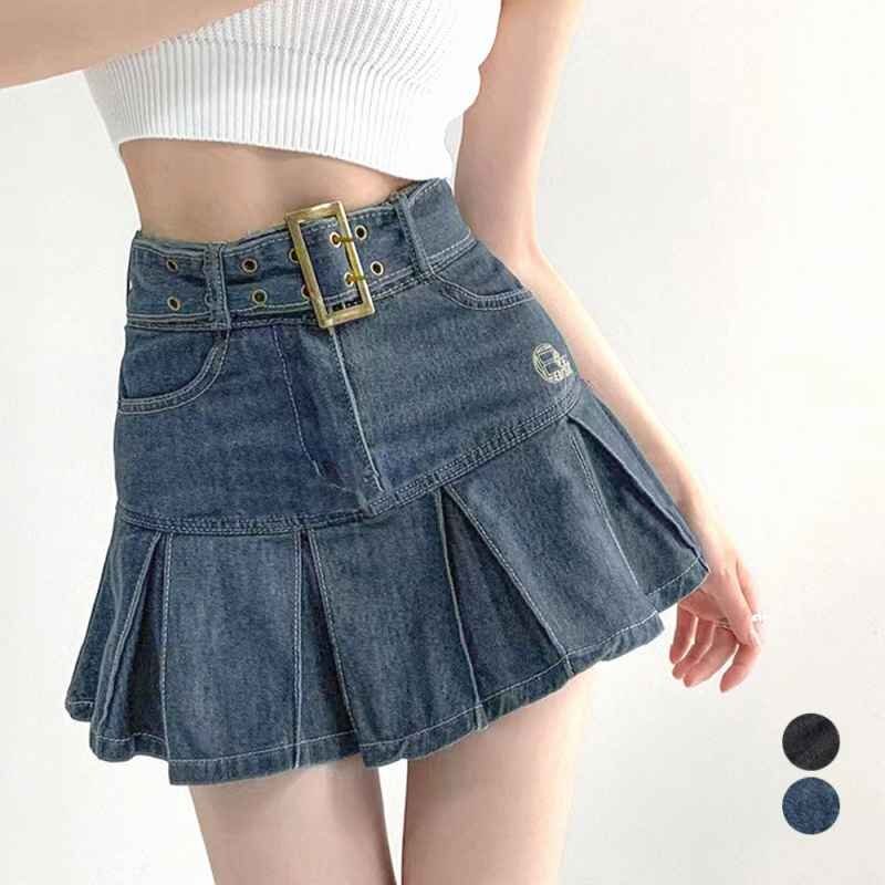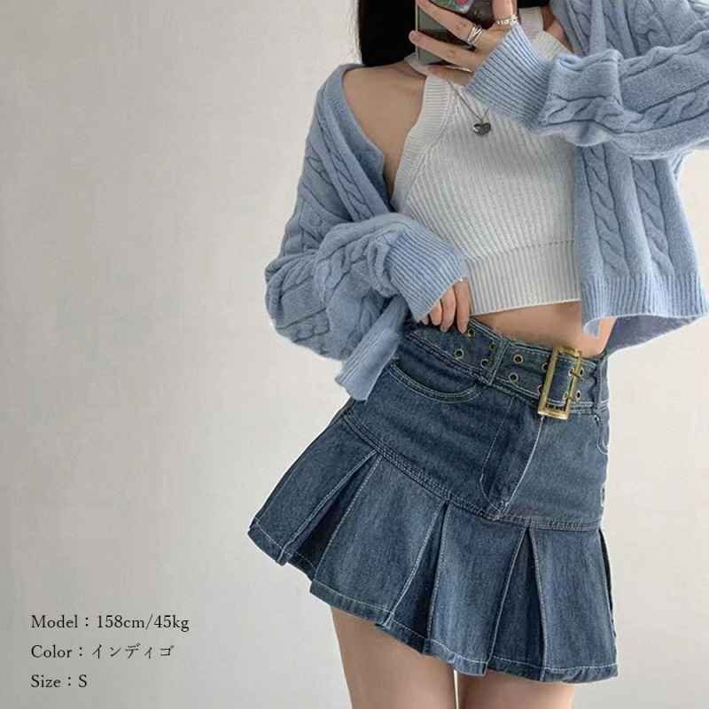 共布の太ベルトを付け、ノスタルジックな雰囲気ながら新鮮なミニデニムスカート