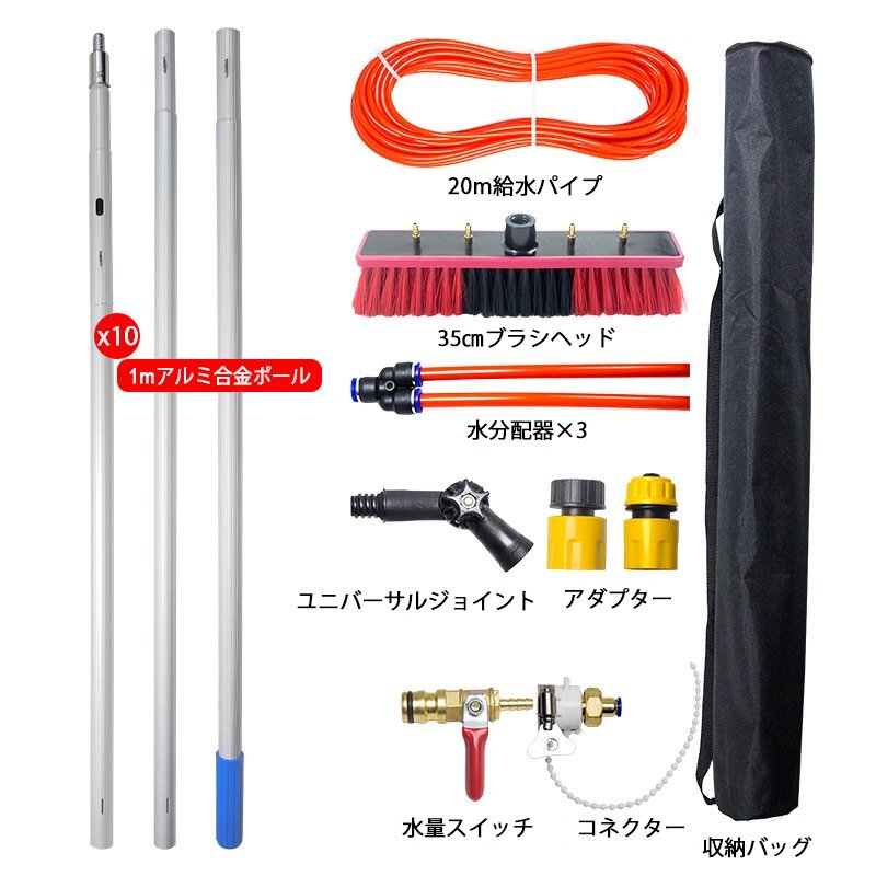 ◇付属品:1mアルミ合金ポール×10、20m給水パイプ、35cmブラシヘッド、水分配器×3、ユニバーサルジョイント×1、アダプター、水量スイッチ、コネクター、収納バッグ