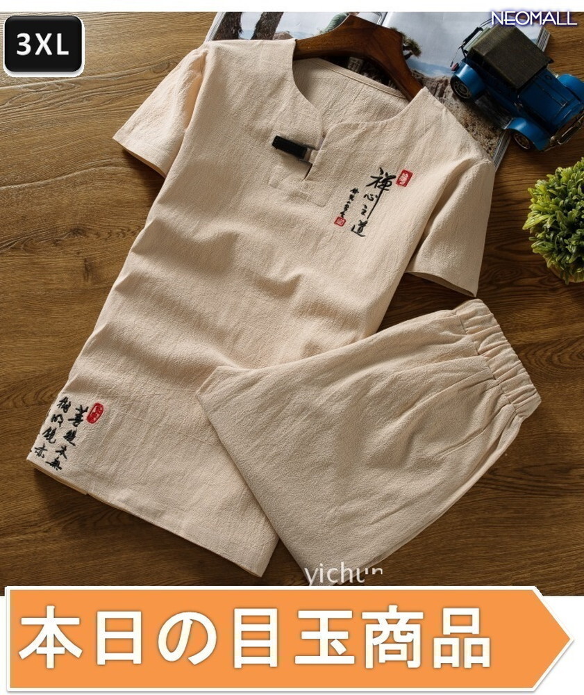 1スタ☆【299】 新品 サマーコットン ヘンリーネック セットアップ ベージュ 3XLサイズ 春 夏 部屋着 ルームウエア