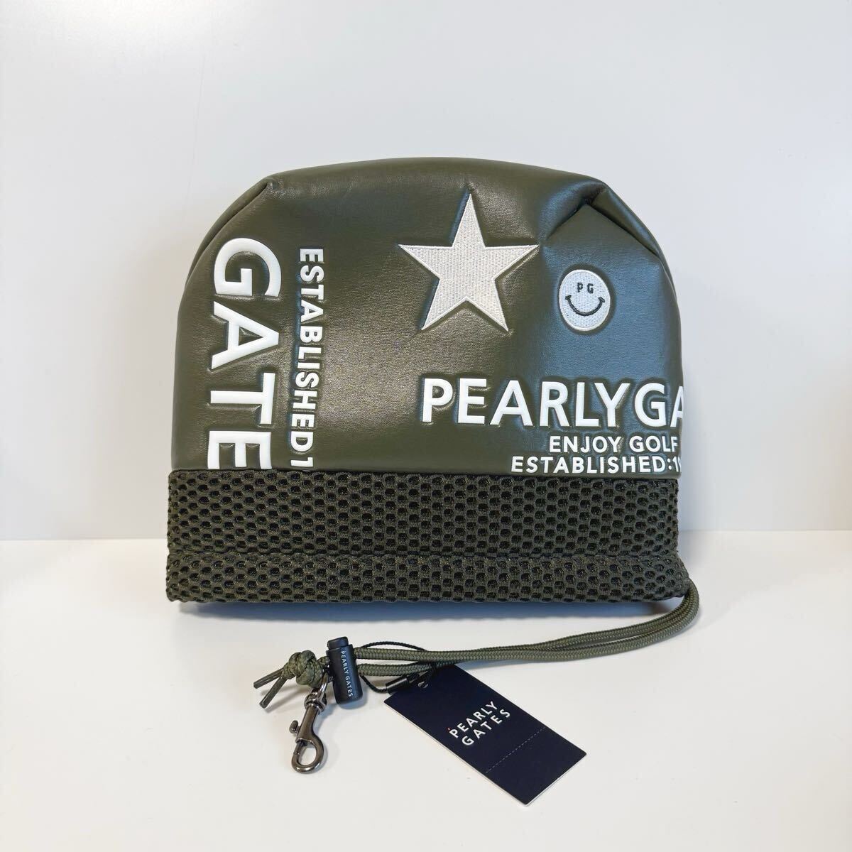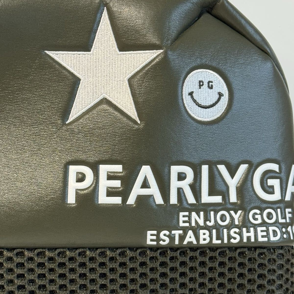 立体的なロゴや星マーク、スマイルロゴが特徴的なパーリーゲイツのアイアンカバー。通気性の良いメッシュ素材と、シックなカラーリングで、クラブを保護しながらバッグのアクセントにもなるアイテムです。