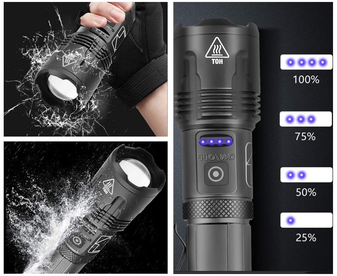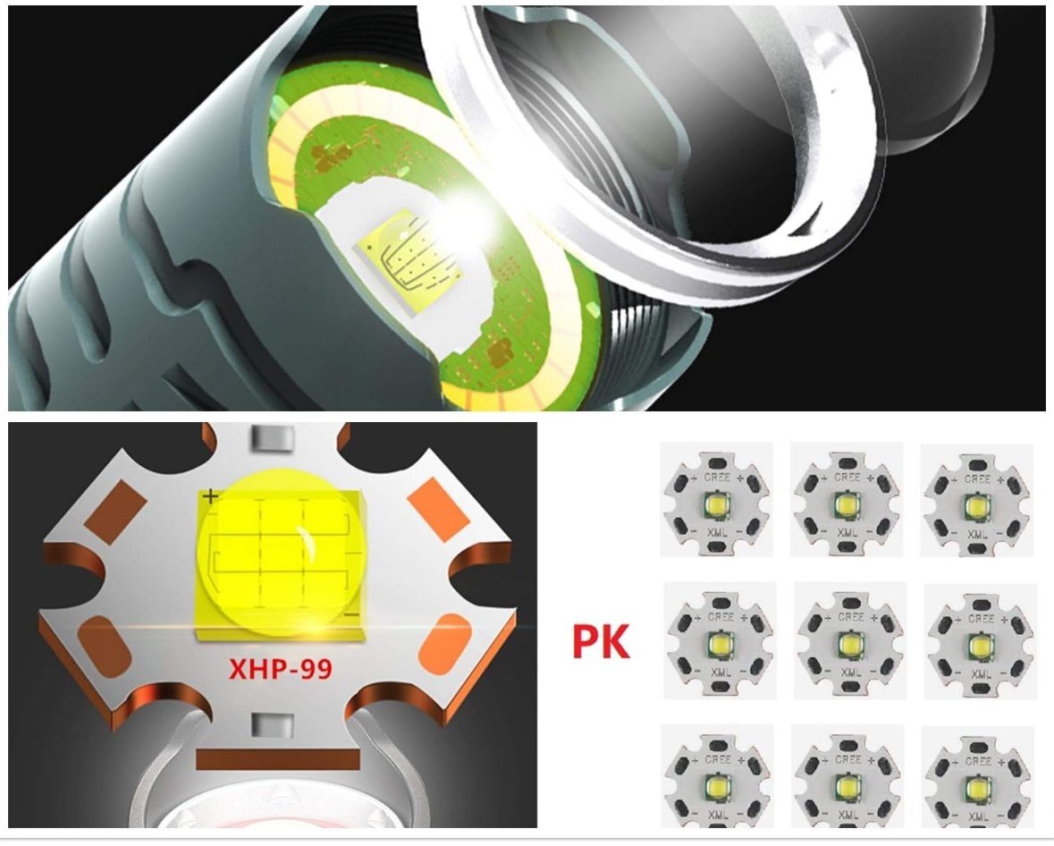 1、輝度アップグレード:最新のXHP99 九核LED使用、9つ独立ledの集合からなり、輝度が高く、照射角度がもっと広いです。 これらのいずれかのled破損しでも、他のled使用に影響を与えることはなく、輝度、使用寿命ともに通常のledの9倍であるといえます。点光源テスト2000ルーメン、射線光源25000ルーメン+ /平方フィート。ズーム可能、照射範囲を任意に調整できます。光学凸レンズ集光:遠射300メートル、可視距離2000メートル(テストデータは天候の影響を受けます)。