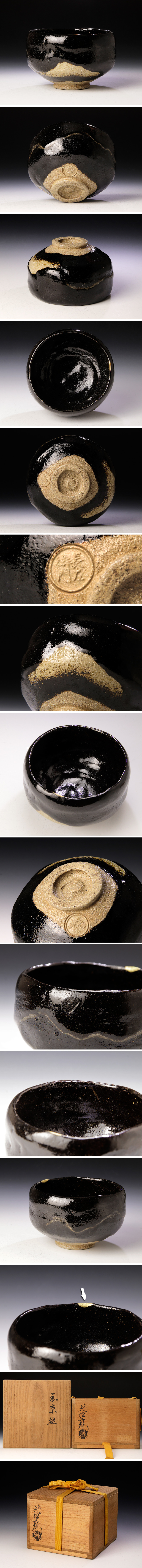 加賀の茶陶を代表する大樋焼。 近代茶道会と密接な関係を築き茶碗作りの名手と称された九代大樋長左衛門の作品。 艶やかな黒釉を主体としながら、釉を掛け残した部分は、その素地の景色がまるで山並みを思わせる表情を生み出しています。 黒釉の深い光沢と、土味をそのまま見せた部分との対比が鮮やかです。 ★商品は九代大樋長左衛門の作品である事を保証致します。 |