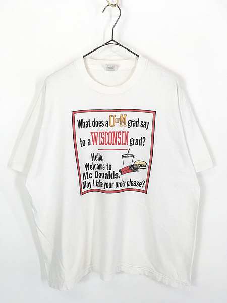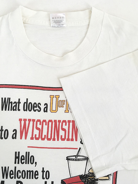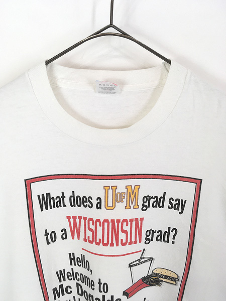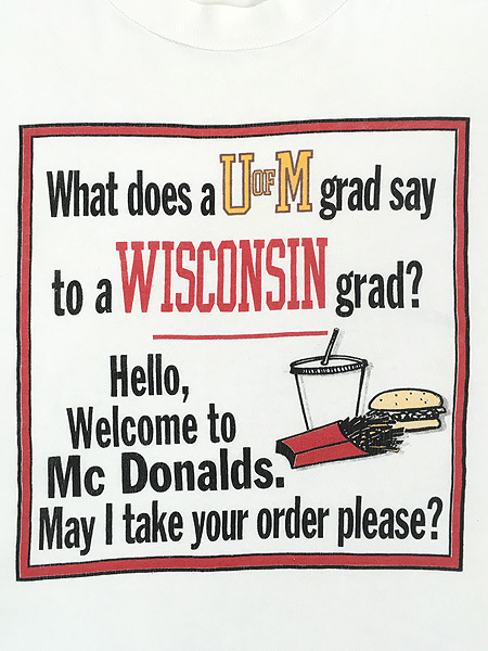 ミシガン大学の卒業生がウィスコンシン大学の卒業生に向けて、「ミシガン大卒はウィスコンシン大卒に対して、マクドナルドで働いている(あるいは逆)」という皮肉を込めて言うというジョークデザインです。裾袖シングルステッチ。