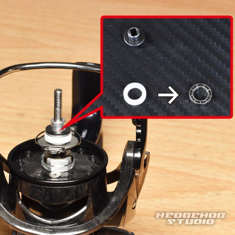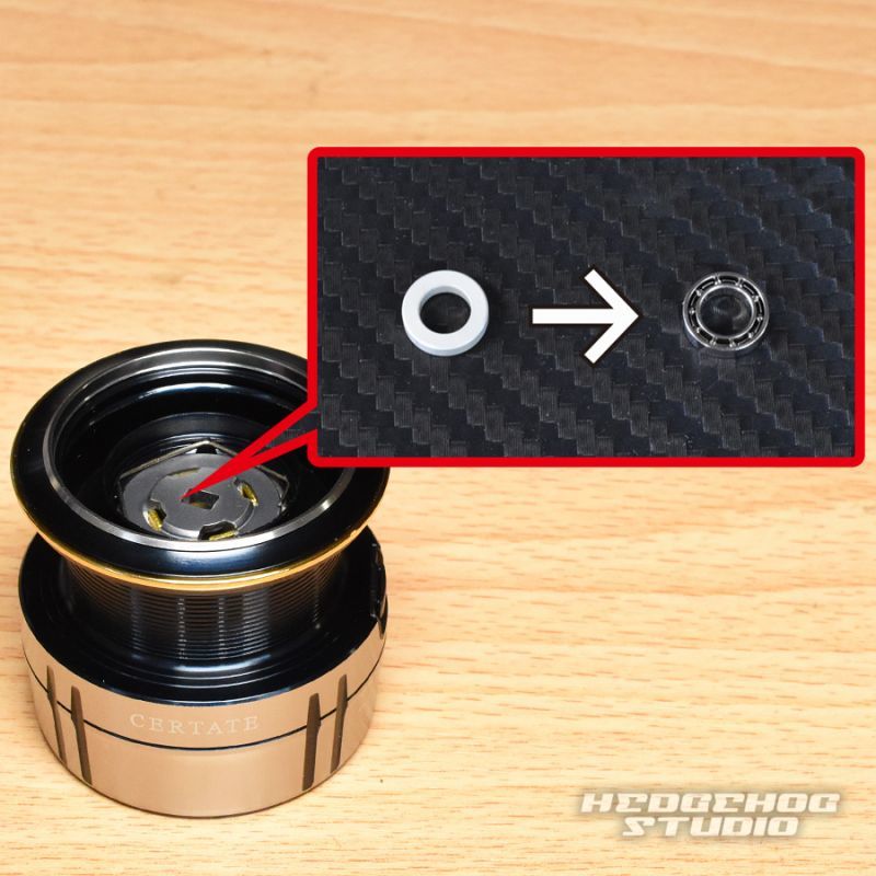 19セルテートのスプールシャフト部に装着されているプラスチック製リングをベアリングに交換してドラグ性能を向上させることができます。