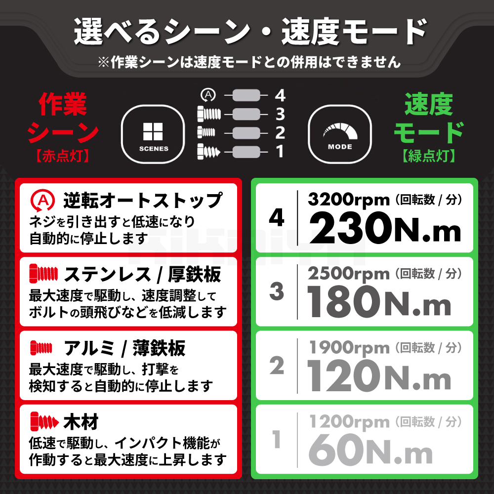 | 無負荷回転数 毎分打撃数 トルク範囲 | モード(4)/ 0~3200rpm / 0~4000BPM / 230Nm モード(3)/ 0~2500rpm / 0~3500BPM / 180Nm モード(2)/ 0~1900rpm / 0~1800BPM / 120Nm モード(1)/ 0~1200rpm / 0~1400BPM / 60Nm |