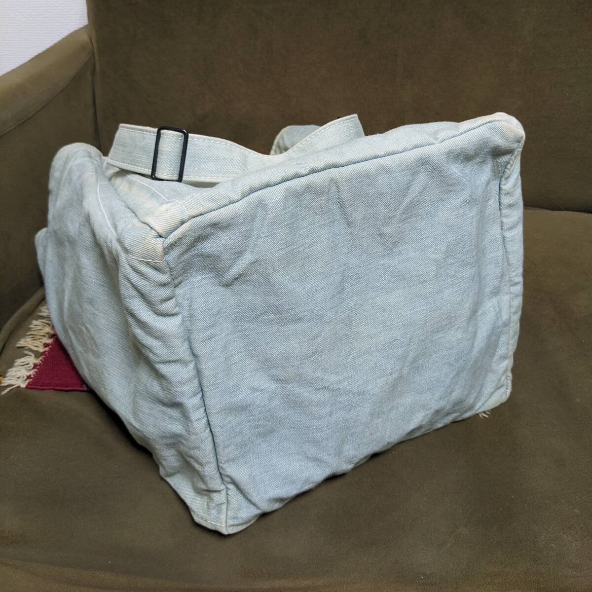 ・タフなヘビーツイル地を、色落ちしたデニムのような淡い色合いにインディゴ染めして、色落ち加工(ウォッシュ加工)で仕上げてあるのだと思います。ステッチ付近の縮み=パッカリングが出来ているのと、とても良い風合いの色落ち感が出ており、ヴィンテージな雰囲気満点です。(再構築を得意とするブランドですし、このバッグもOLDのファブリックを染め直してあるのかもしれません。)