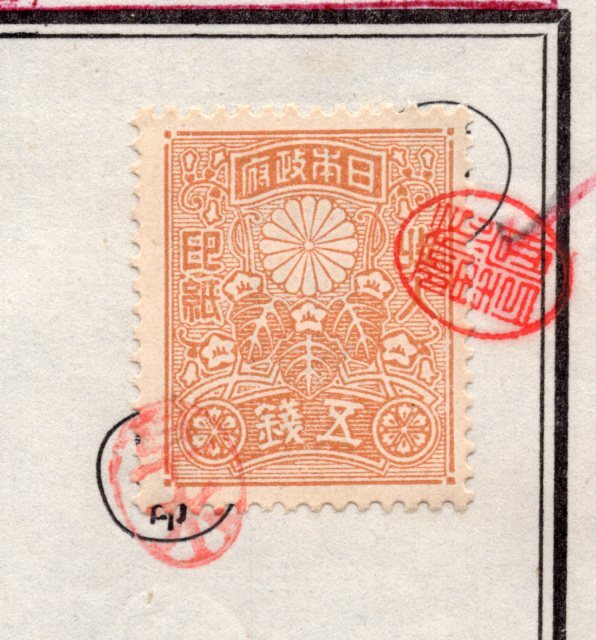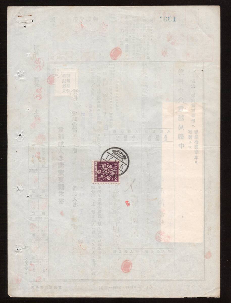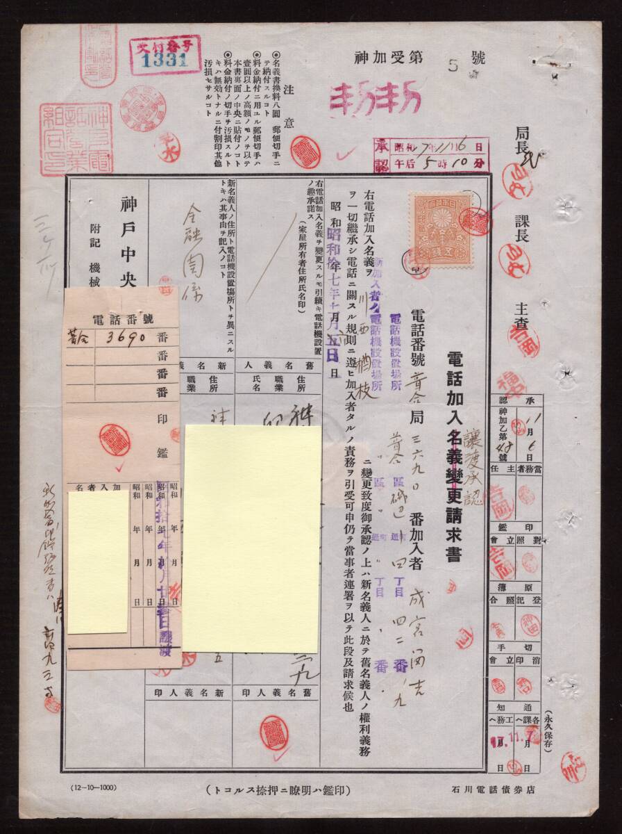 『電話加入譲渡承認請求書』② 5銭収入印紙・梅花模様100円貼『神戸中央/17.11.6/電話局』