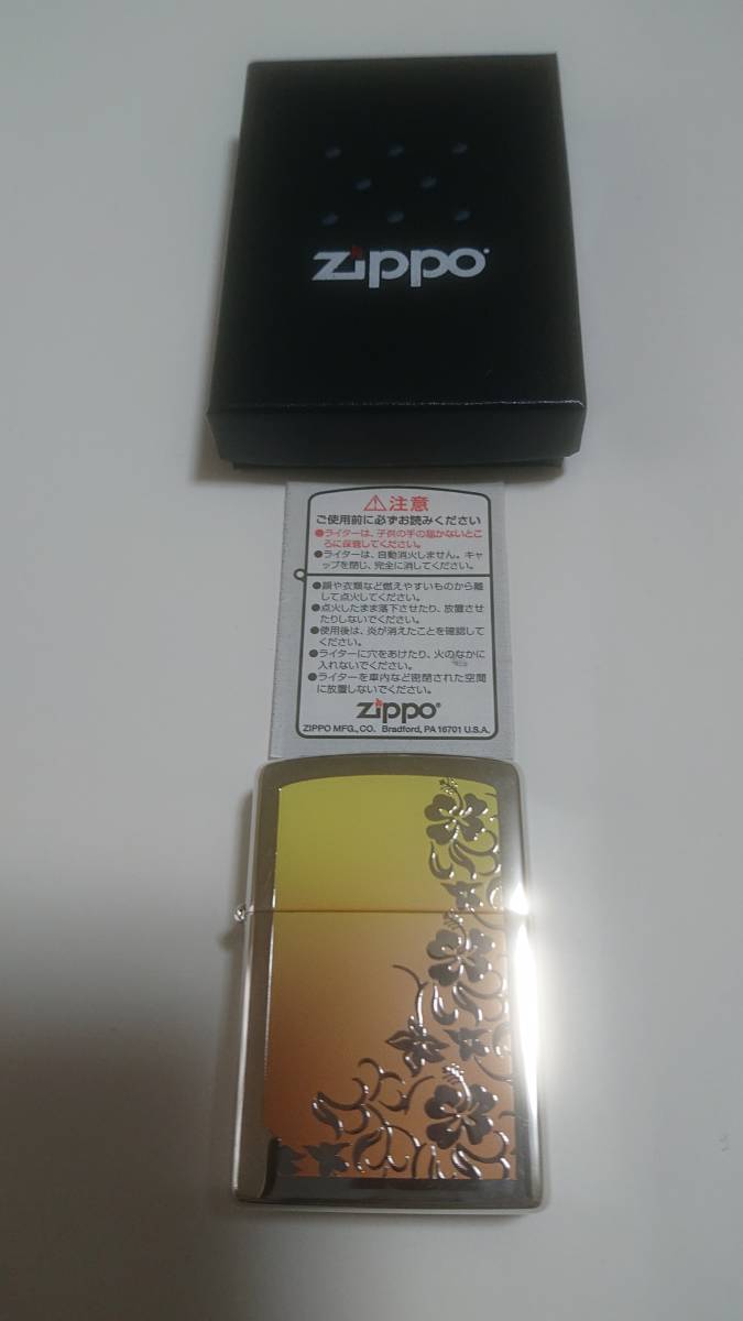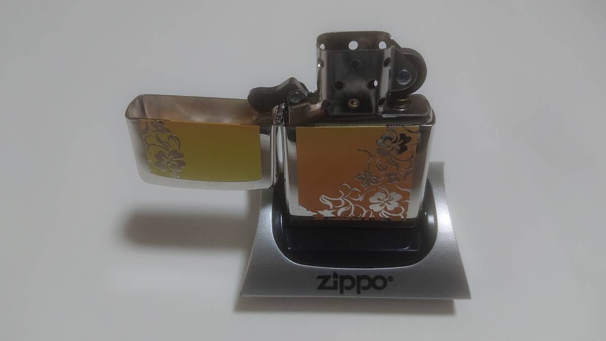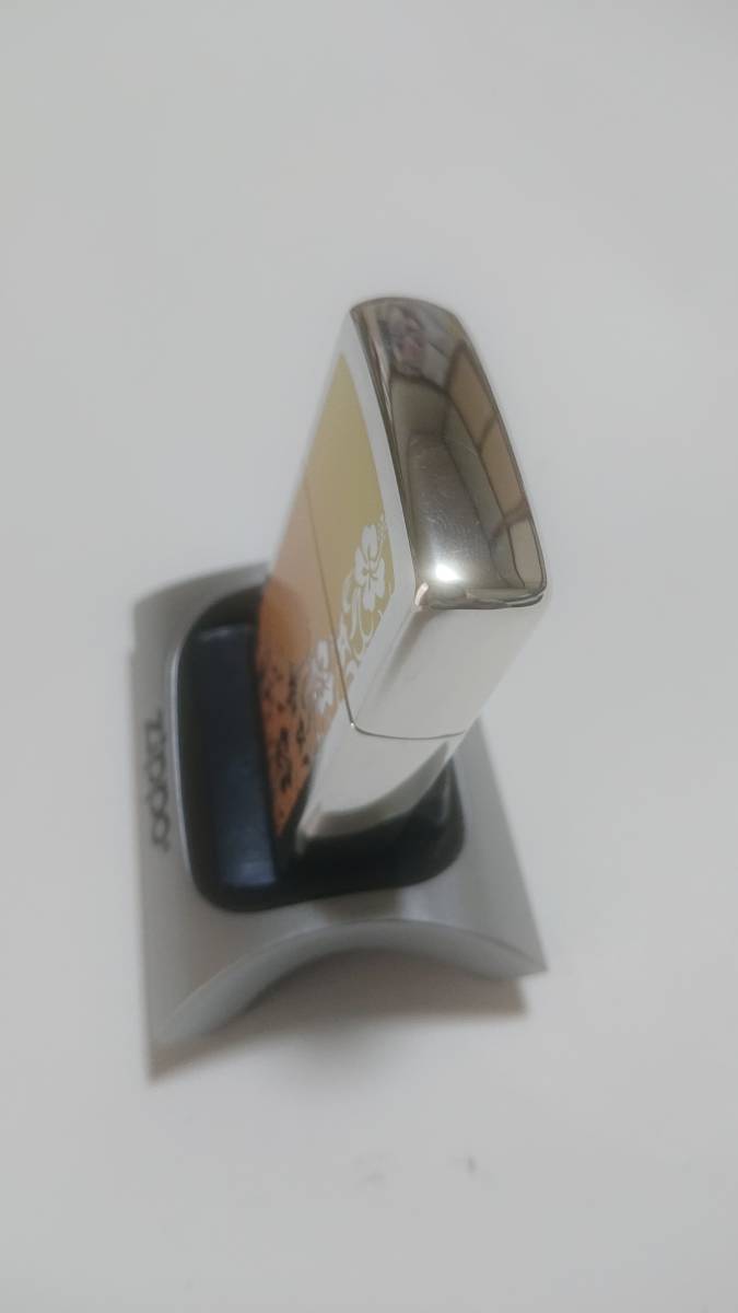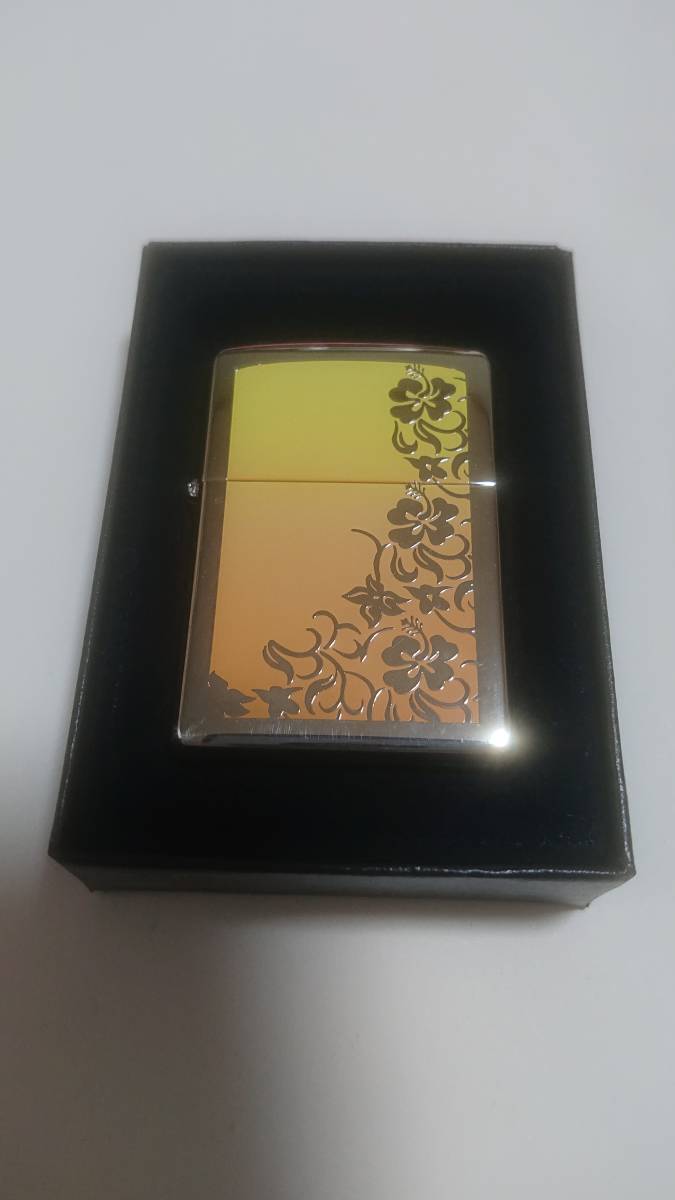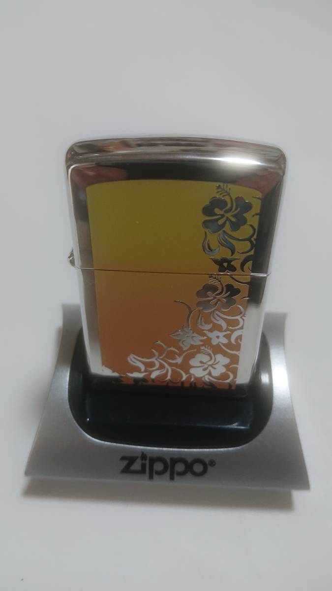 オレンジ、イエローのグラデーションにハイビスカス、シルバーインレイ加工のZIPPOです。
