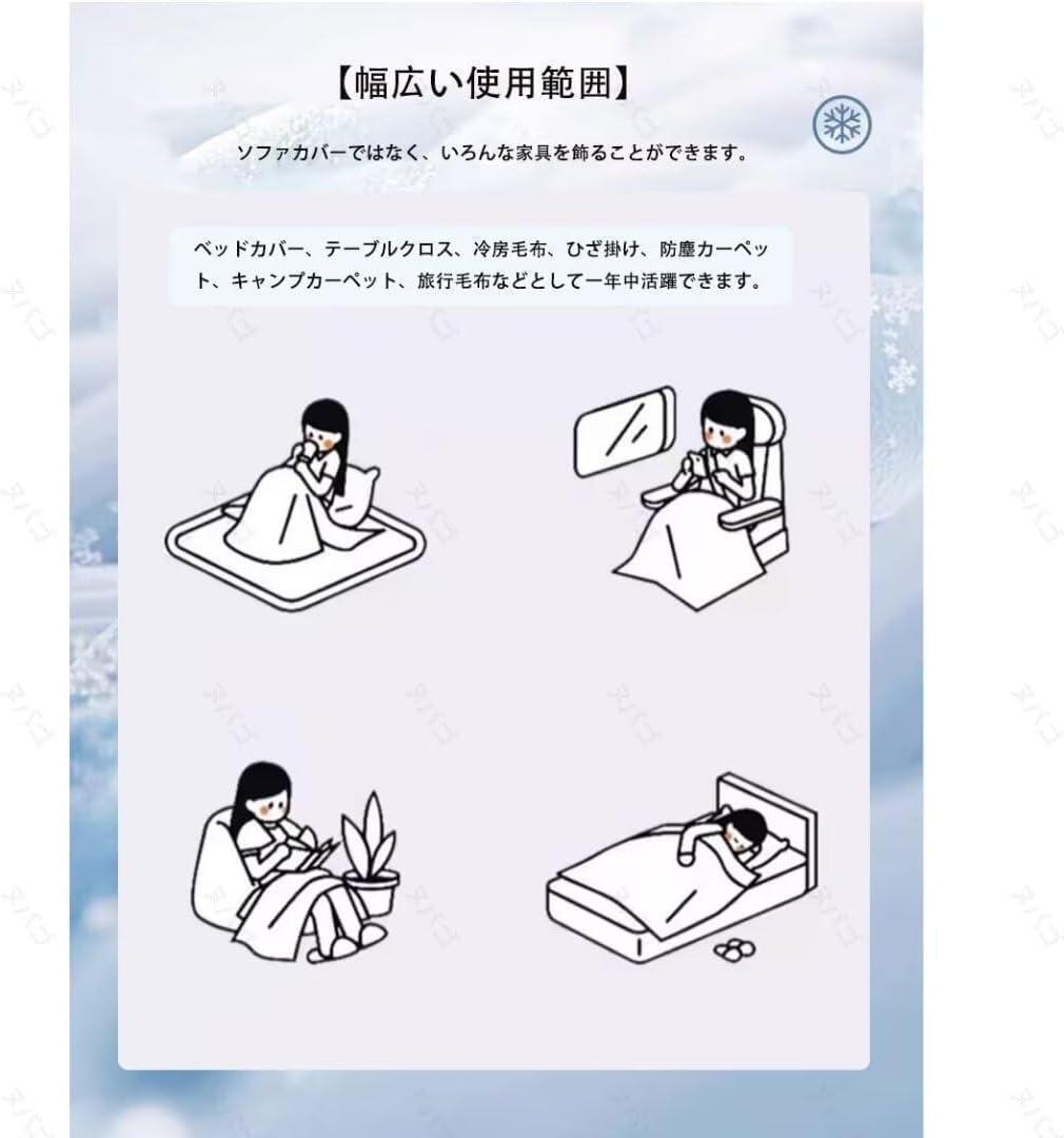 ・ソファカバーとしてだけでなく、ベッドカバー・テーブルクロス・ひざ掛け・防塵カーペット・キャンプカーペット・旅行毛布など多用途に使える。
